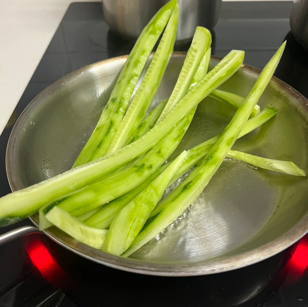오이 넣은 김밥 해 먹으려고요. 오이를 씻고 껍질을 적당히 벗겨 김밥용으로 길쭉하게 잘랐습니다. 스텐 프라이팬을 시간을 들여 예열하고 기름을 두른 후 오이를 촤라락 넣었습니다. 그런데 말이죠. 프라이팬이 많이 작더라고요. 빳빳한 오이 양쪽 끝이 프라이팬 속에 들어가지 못하고 이쪽저쪽으로 튀어나와요.