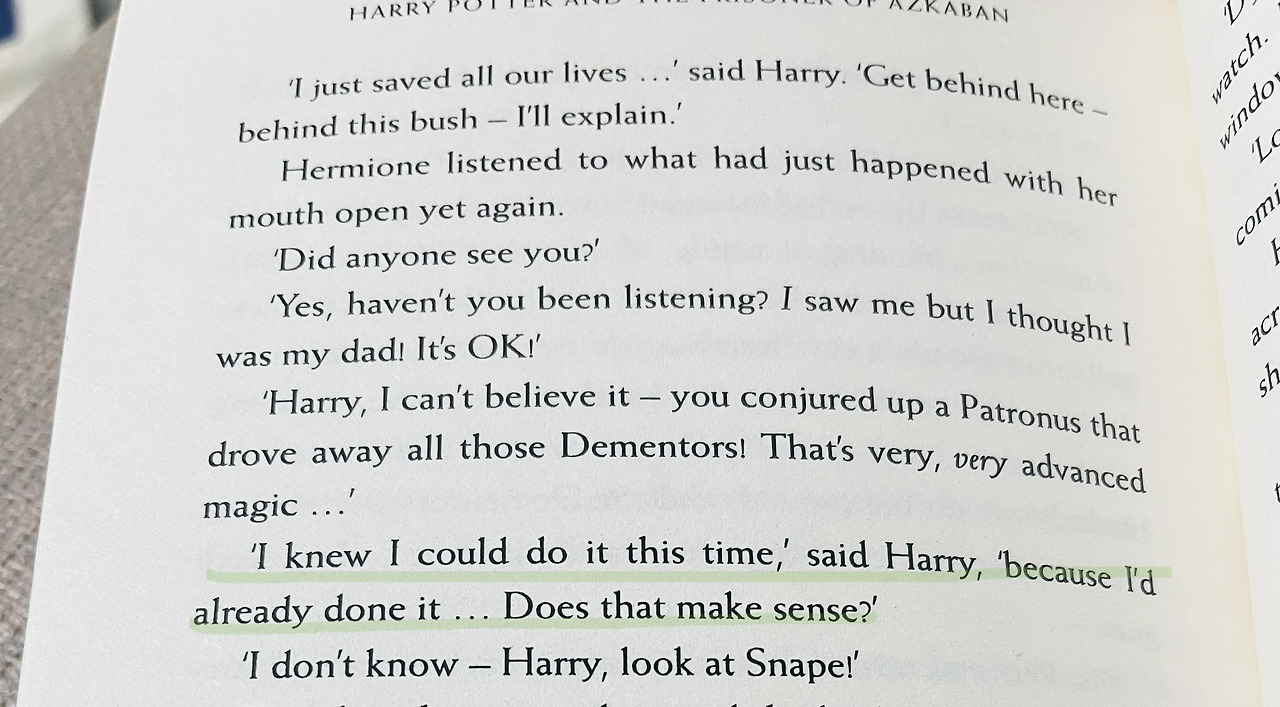 영화에선 미래(?)에서 온 헤르미온느가 늑대 소리를 내서 과거 혹은 현재의 해리가 늑대인간으로부터 도망칠 수 있었고, 쫓아온 늑대인간은 벅빅이 쫓아줬고, 디멘터로부터 해리와 시리우스를 구하는 것은... 미래로부터 온 현재의 해리 그 자신이었습니다... 그러니까 그 아이를 미래의 해리라고 해야 하는지, 그곳에서 디멘터의 키스를 받는 아이가 과거의 해리라고 해야 하는지 좀 헷갈리긴 합니다만. 미래와 현재와 과거가 함께 나를 구합니다.