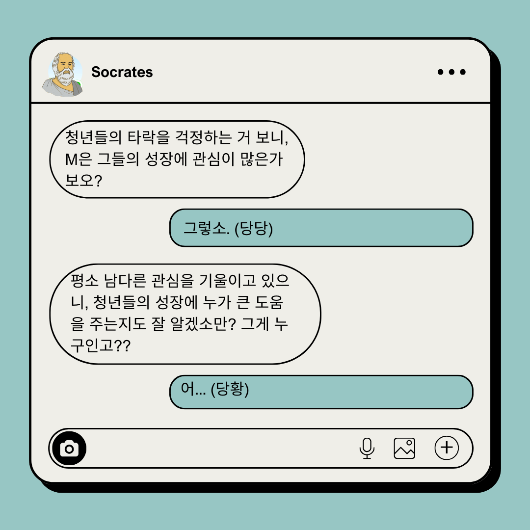 청년들의 타락이 우려된다며 기소장을 내민 이들이 사실상 청년들의 성장이나 타락에 대해 제대로 고민해 본 적이 있는지 소크라테스는 묻고 있습니다. 기소인이 안다고 자부하고 있지만 사실은 제대로 모르고 있다는 것을 드러내주는, 그의 질문법인 거죠.