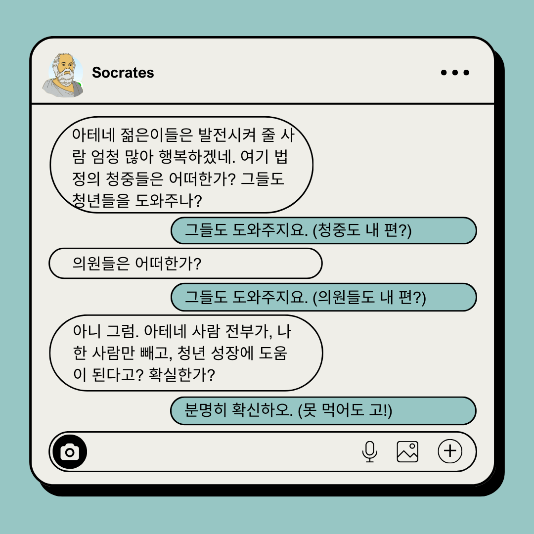 모든 아테네 사람들이 청년을 도와주는데 그만 예외라는 것도 억지처럼 보입니다만. 무엇보다 아테네 청년을 도와줄 이가 이렇게나 많은데 소크라테스 한 사람이 청년들을 타락시킨다면, 그의 말이 가진 힘이 엄청나다는 것을 인정하는 것. 소크라테스는 앞서 말의 힘은 진실을 말할 때 얻어지는 것이라 언급한 바 있습니다. 그에 의한 타락이 아님을 인정하면 기소내용에 반하는 것. 멜레토스는 곤란합니다.