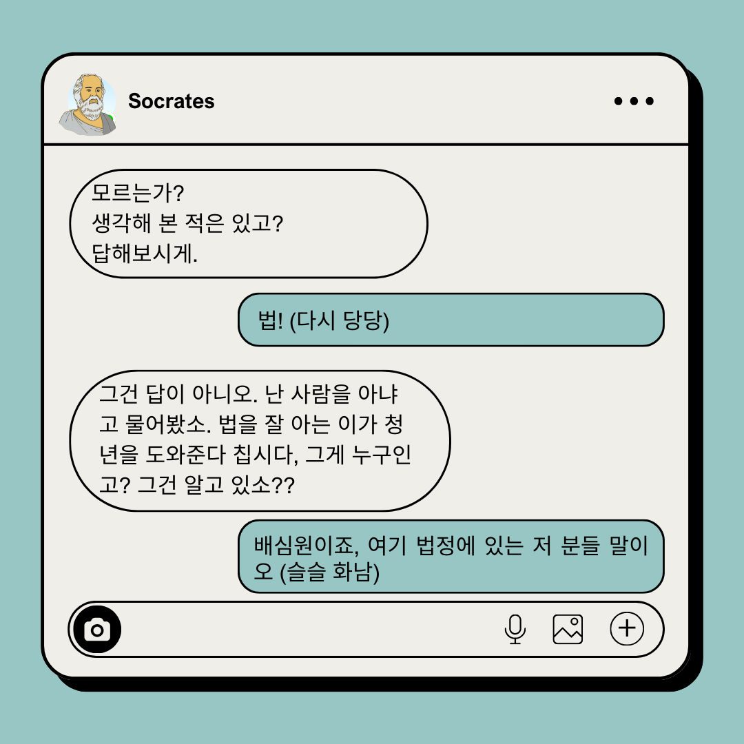 여기서 멜레토스가 배심원 일부라고 답했다면, 구체적으로 누구냐는 질문이 들어왔을 것이고, 그 답변에서 소외된 배심원은 자기편이 아니게 될 가능성이 높아졌겠죠. 멜레토스도 그것을 알고 있었겠죠?! 이건 뭐 법정 드라마 보는 기분입니다. 소크라테스에 대한 뿌리 깊은 반감이 없는 배심원과 청중이라면, 멜레토스 말이 앞뒤가 안 맞는 것을 느꼈을 겁니다. 멜레토스는 이쯤 '뭐라고 답해야 할까? 어떻게 답해도 이상하네'하는 곤란한 표정을 짓고 있었을 것 같네요.