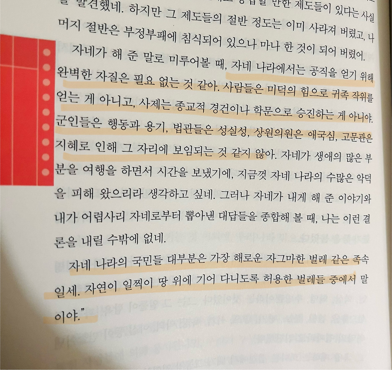 책은 인연보다는 그들을 통해 만나는 새로운 세계, 거기서 반추하는 현실 세계에 주목합니다. 이 책의 웃음포인트이자 매력이지요. 1726년이나 2024년이나 정치판은 어찌나 그리 닮았는지 몰라요. 인간이 이룬 고귀함, 과학, 정치, 법치, 명예 등을 아주 신랄하게 풍자하고 아무것도 아닌 것으로 만듭니다. 그래서 쓴웃음을 참 많이 짓게 되는데, 계속 읽으면서 힘이 좀 빠지기도 해요.