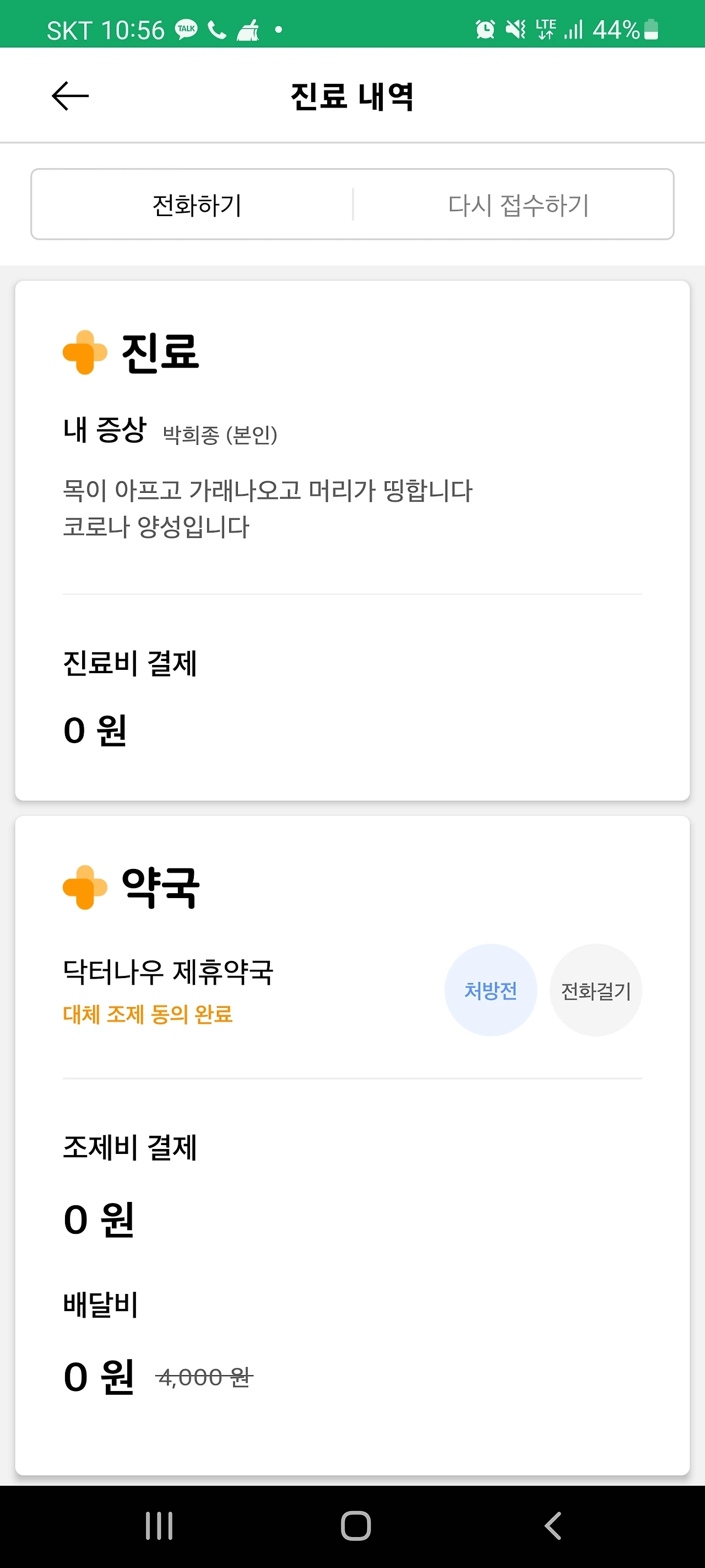 그리고 오후 6시에 양성 확진 문자가 왔다. 나는 이미 예상을 하고 있어서 그랬는지, 생각보다 당황스럽지는 않았다. 차분하게 주위 사람들에게 알리고, 원격진료를 신청했다. 이미 장은 미리 다 봐 났지만, 약은 딱 떨어졌었다. 다행히 누나가 그 사실을 알고 원격진료가 가능한 어플을 보내줬다.