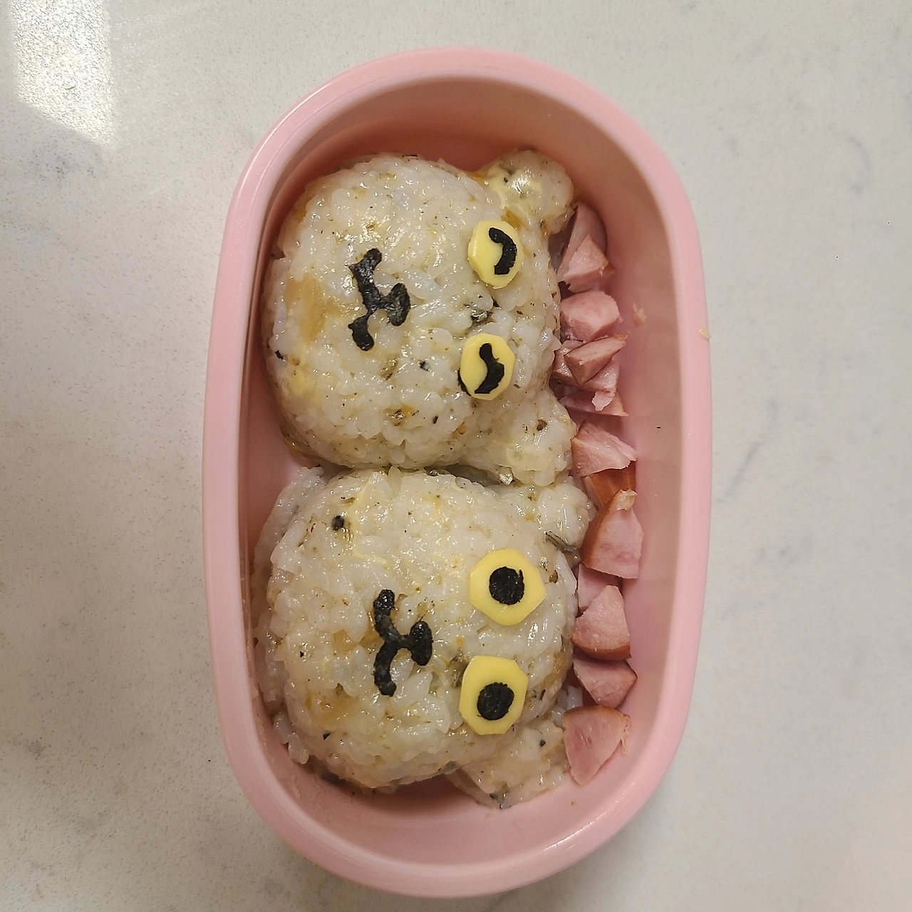 그렇게 만들어진 밥은 곰돌이 주먹밥 틀에 넣어 모양을 잡았고, 미리 만들어 둔 눈코입으로 완성시켰다. (원래 문어 소시지도 만들었지만, 아이 도시락에 자리도 없었고, 예쁘긴 해도 아직 아이는 소시지를 먹지 않아서 과감히 뺐다.)