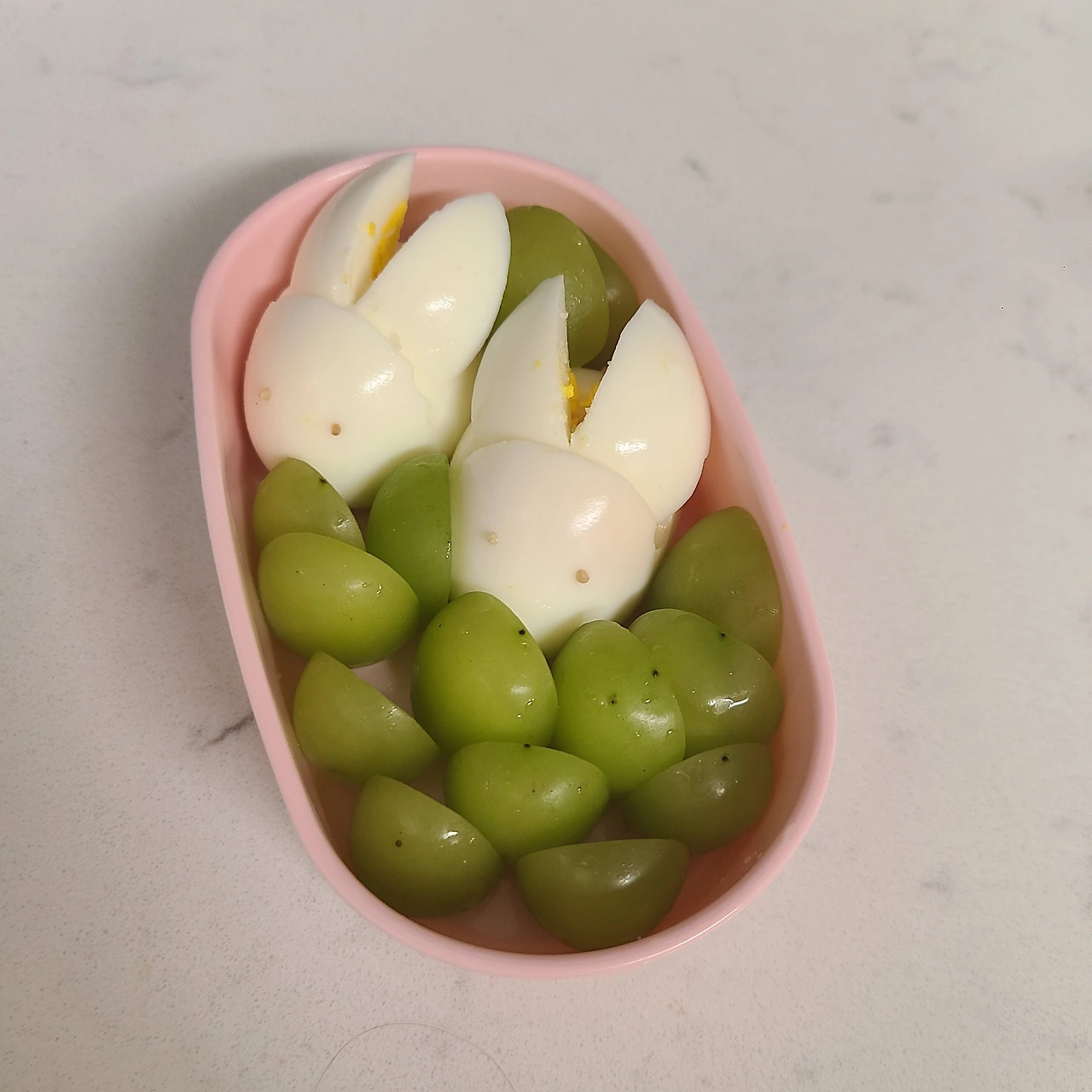 아이를 재우고, 집 정리를 좀 하고, 내일 도시락 준비를 사부작사부작하니 벌써 1시였다. 나는 알람 시간을 평소보다 한 시간 일찍 맞춰두고는 잠자리에 들었다. 새벽 6시에 일어난 나는, 제일 먼저 밥부터 했다. 그리고 밥이 되는 동안 삶은 계란의 껍질을 까서 토끼를 만들기 시작했다. 실패를 예상해서 5개의 계란을 삶아 놨는데, 다행히도 하나만 실수를 하고 나머지 두 개를 성공했다. 난이도가 높은 건 아니었지만, 깨로 눈을 만드는 것이 여간 섬세한 작업이 아니어서 미리 사두었던 핀셋 집게로 심혈을 기울여서 겨우 성공했다. 도시락 통에 넣은 토끼에 허점함도 채우고, 흔들리지도 않게 하기 위해 샤인 머스캣을 손질해서 풀밭을 만들었다.