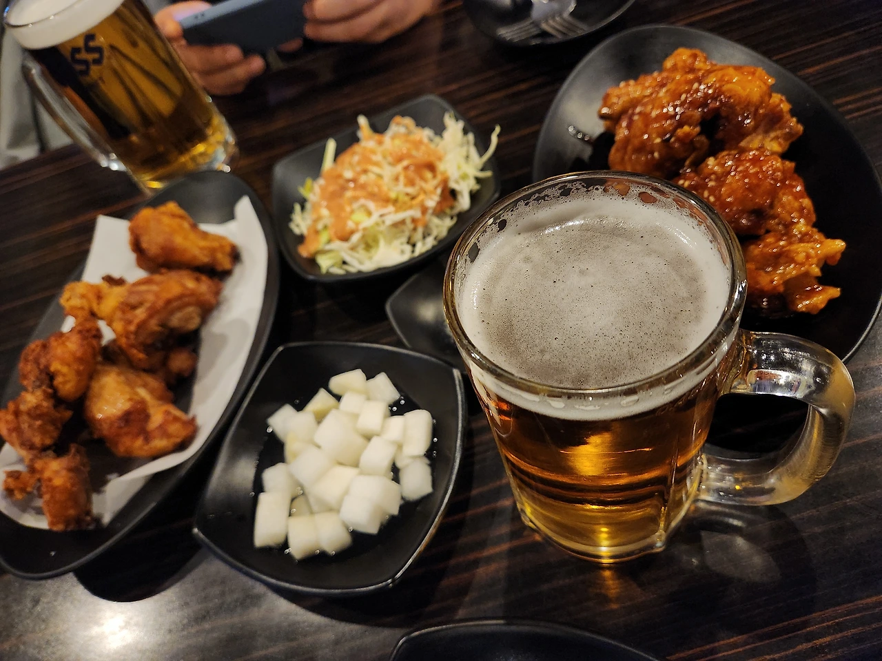 오랜 맛집에서 생맥주에 후라이드반 양념반으로 사탕을 대신하고 닭다리를 좋아하는 아이에게 줄 반마리를 포장하고 집으로 간다.