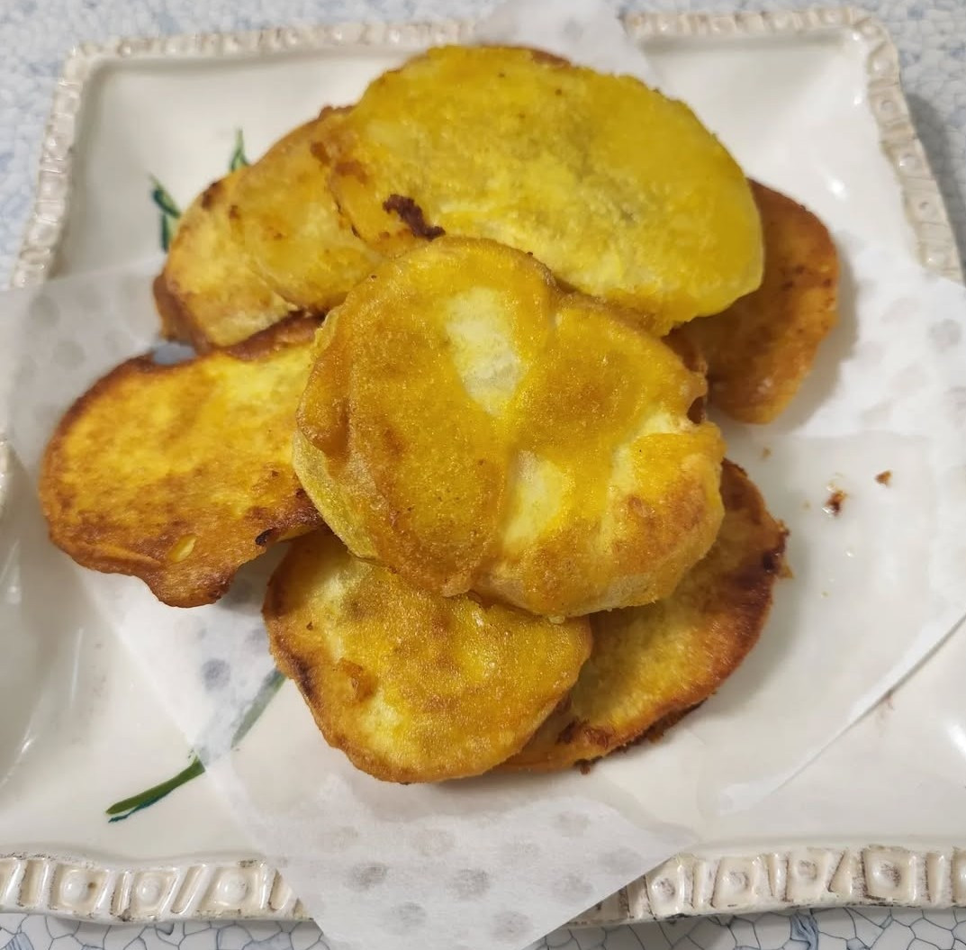 [치자물 반죽으로 샛노란 고구마부침개 - 부산이 고향인 엄마는 항상 고구마 부침개를 하셨다.]