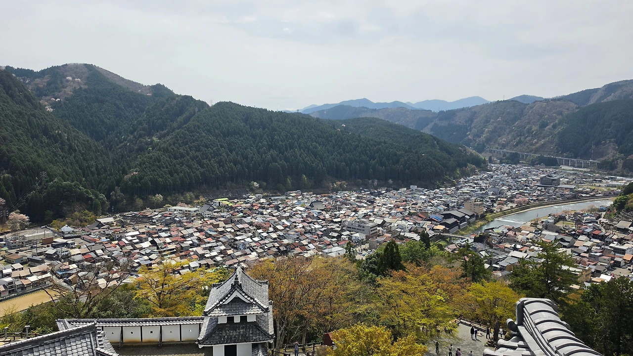 차를 타고 성 입구까지 올라갈 수 있고, 입장 티켓을 구매한 뒤 천수각까지 올라서면, 마치 거대한 물고기가 헤엄치는 듯한 형상의 마을 전경이 한눈에 들어옵니다. 일본의 많은 성이 콘크리트로 재건축되어 현대적인 느낌을 주는 것과 달리, 이곳은 1933년에 목조로 재건된 일본 내에서 가장 오래된 목조 재건 천수각이라고 합니다. 그래서인지 여느 관광지의 성과는 사뭇 다르게, 나무 계단을 밟을 때 삐걱 거리는 소리가 들리는, 나름 고풍스럽고 한적한 매력이 살아있습니다.
