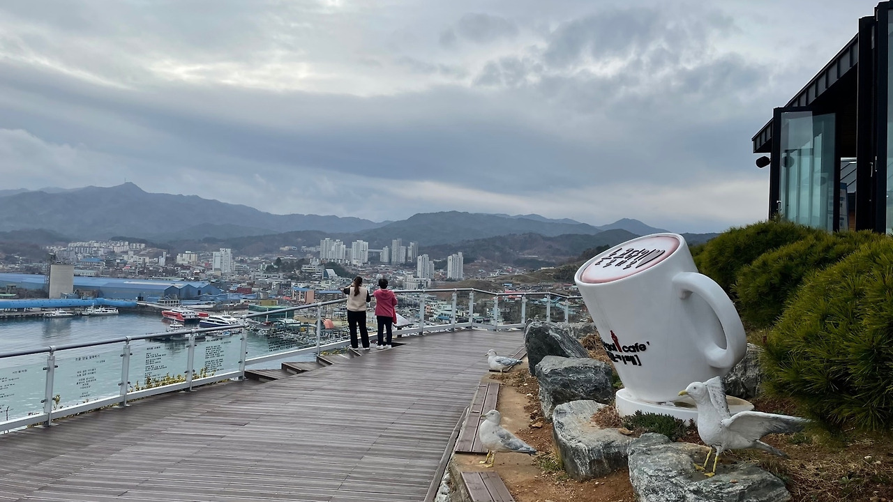 종일 카페에 있다 오는 길이었기 때문에, 카페 내부에 들어가 보진 않았다. 그렇지만 사진에서 보던 것과 같이 너무나 예쁜 전망의 카페였다. 잠깐 커피잔 모양의 조형물 앞, 벤치에 앉아 바다 구경을 했다. 아래에서 가까이 보는 바다와는 또 다른 느낌이었다. 탁 트인 전망이 그렇게나 시원했다. 비도 마침 그쳐줘서 다행이었다. 춥지도 않고, 적당히 불어오는 시원한 바람에 '행복하다'라는 생각이 웃음 새듯 새어 나왔다.