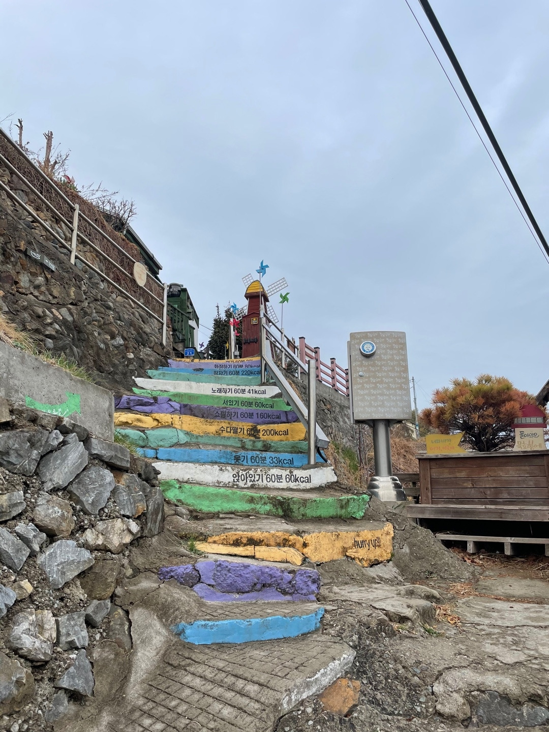 올라가는 길에는 형형색색의 바람개비들이 바람에 팽팽 신나게 돌고 있었다. 예쁜 색들로 칠해진 벽화와 계단에 쓰인 글귀도 헉헉대며 감상했다. 경사는 역시나 엄청났다. 내가 이렇게 헉헉 대는 건 마스크 때문에 그런 거야..라고 없어 보이는 셀프 변명을 하며 그렇게 언덕길을 올랐다.