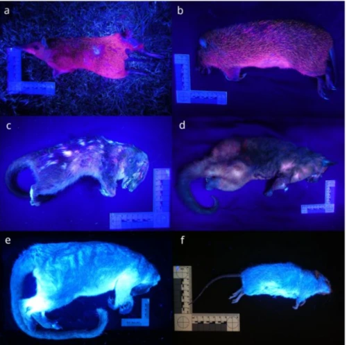 북부 롱노즈밴디쿳, 북부 브라운밴디쿳, 북부쿠올, 쿠퍼색 브러시테일포섬, 럼홀츠 나무캥거루, 필드랫, 오리너구리까지 일곱 종의 털에서 '프로토포르피린'이라는 공통의 빛을 확인했다. 프로토포르피린은 혈액, 피부, 털 등에 존재하는 색소 분자로, 특정 파장의 빛을 흡수해 형광을 내는 특징이 있다.