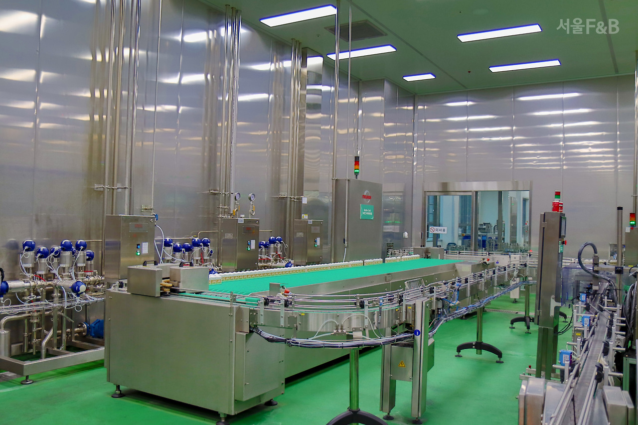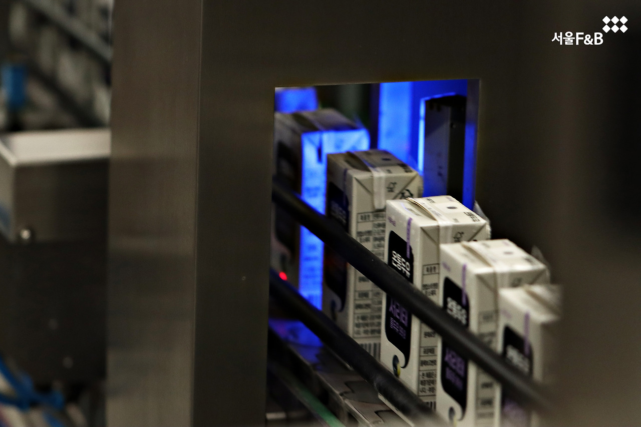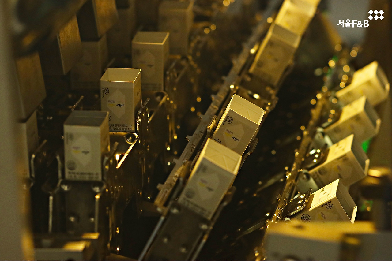 서울에프엔비의 균질, 멸균, 충전 등 공정은 모두 자동화 시스템으로 시간당 24,000개, 일평균 250만 개 이상의 생산 능력을 갖춘 곳입니다. 특히 멸균과정에서 서울에프엔비의 푸드테크의 High Quality Equipment 진가가 발휘되는데요. 이 과정에서 상온 보존이 가능하게 하는 열처리 공정으로 고온순간 멸균기를 이용해 제품의 영양성분 손실이 없도록 하며, 미생물 및 포자를 완전히 사멸해 무균 상태를 만듭니다. 이후 아셉틱(Aseptic) 무균충전기를 통해 충전, 밀봉, 멸균 등의 과정을 거쳐 비로소 제품이 탄생하게 됩니다.