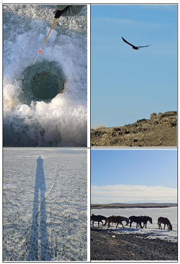 17시 어기 호수 도착. 우와~~~ 호수 위로 푸르공이 지나다니고 사람들은 빙어낚시 중이다. 얼음 축제의 뒤끝인지 얼음 조각도 몇 개 보인다. 언니들은 호수로 걸어 들어가 인생사진 남기느라 분주하고, 난 낚시에 눈을 뺏겼다. 몽골은 이 찬란한 장면들을 도대체 언제까지 펼쳐 놓을 작정인가!