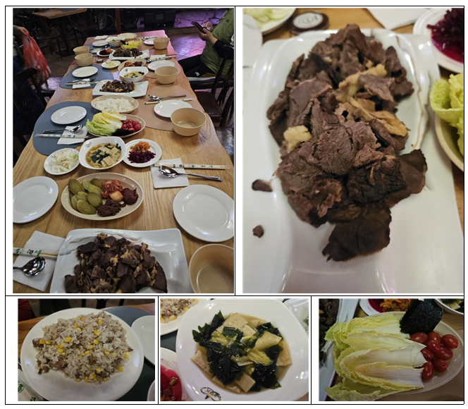 정성스런 식탁 차림에 눈이 휘둥그레진다. 그리고 말고기의 맛! 돌을 넣고 수육처럼 찌는 허르헉, 손님 접대용 최고의 요리라 했다. 어느 가이드가 이토록 정성스럽게 손님을 모실까! 고마움의 마음이 하늘로 솟구친다, 다른 할매들도 그런가 보다. 쇠고기 특유의 잡내가 전혀 없다. 담백하고 구수하다. 고기를 즐기지 않는 나조차도 자꾸자꾸 집어먹는다. ”암트타이(맛있어요)!“ 외삼촌도 잘 먹는 우리를 보며 흐뭇한 미소를 띄고 있다. ”툴루우(건배)!“
