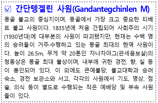 울란바토르 거리는 여전히 분주했지만, 간단사원 안은 2023년 9월의 시간이 흐르고 있었다. 멋모르고 찾은 사원에서 맛있는 밥과 간식과 카레를 얻어먹고, 심지어는 돈까지 받았었다. 사원의 축제였고, 그 시기에는 누구든 할 수 있는 만큼 보시를 하는 기간이었나 보다. 기도 촛불을 옮기는 행사에 동참했고, 그 거룩한 빛들이 모여 스러지는, 그을음 가득한 성스러운 장소도 보았다.