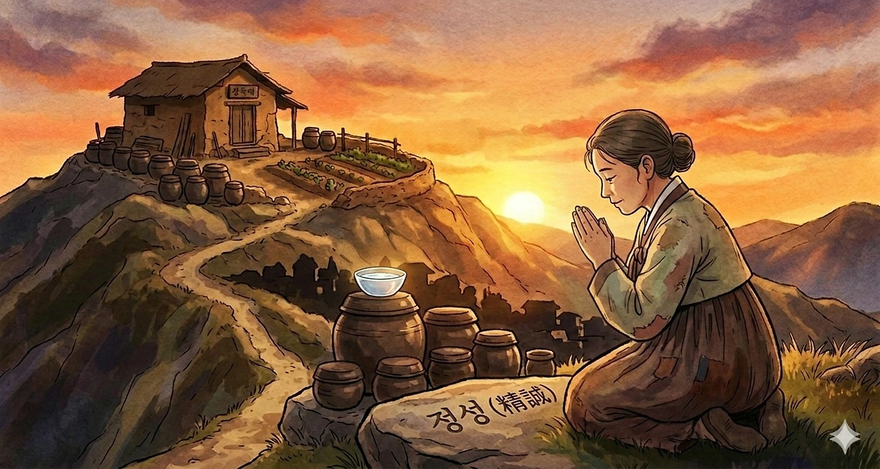 집이 완성되어 가던 어느 새벽, 자욱한 안개가 산꼭대기를 감싸 안은 시간. 어머니는 장독대 위에 맑은 정화수 한 그릇을 떠놓고 간절히 머리를 숙이셨습니다. 어머니의 기도는 소리가 없었으나 광장 위의 웅변보다 더 쩌렁쩌렁하게 내 심장을 울렸습니다.