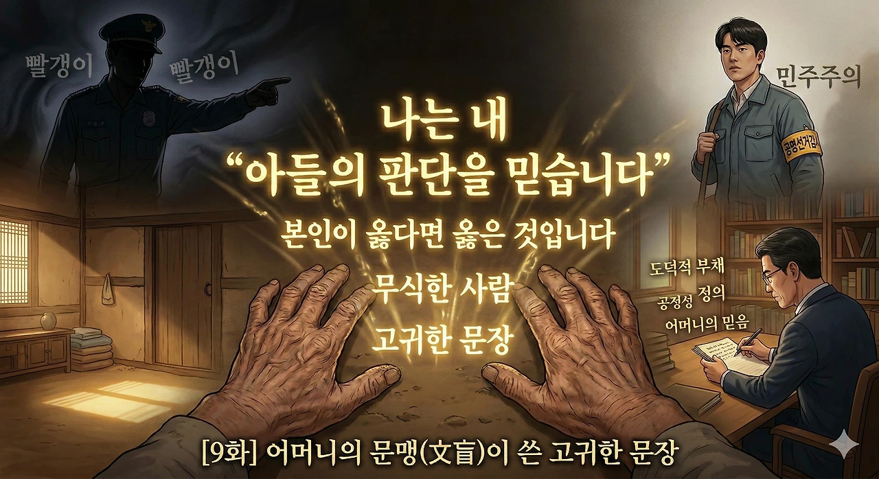 "대학까지 보낸 아들이 빨갱이가 되었다는 순경의 위협 앞에, 글자 한 자 모르는 나의 어머니는 인생에서 가장 서슬 퍼런 '신뢰의 문장'을 써 내려가셨습니다."