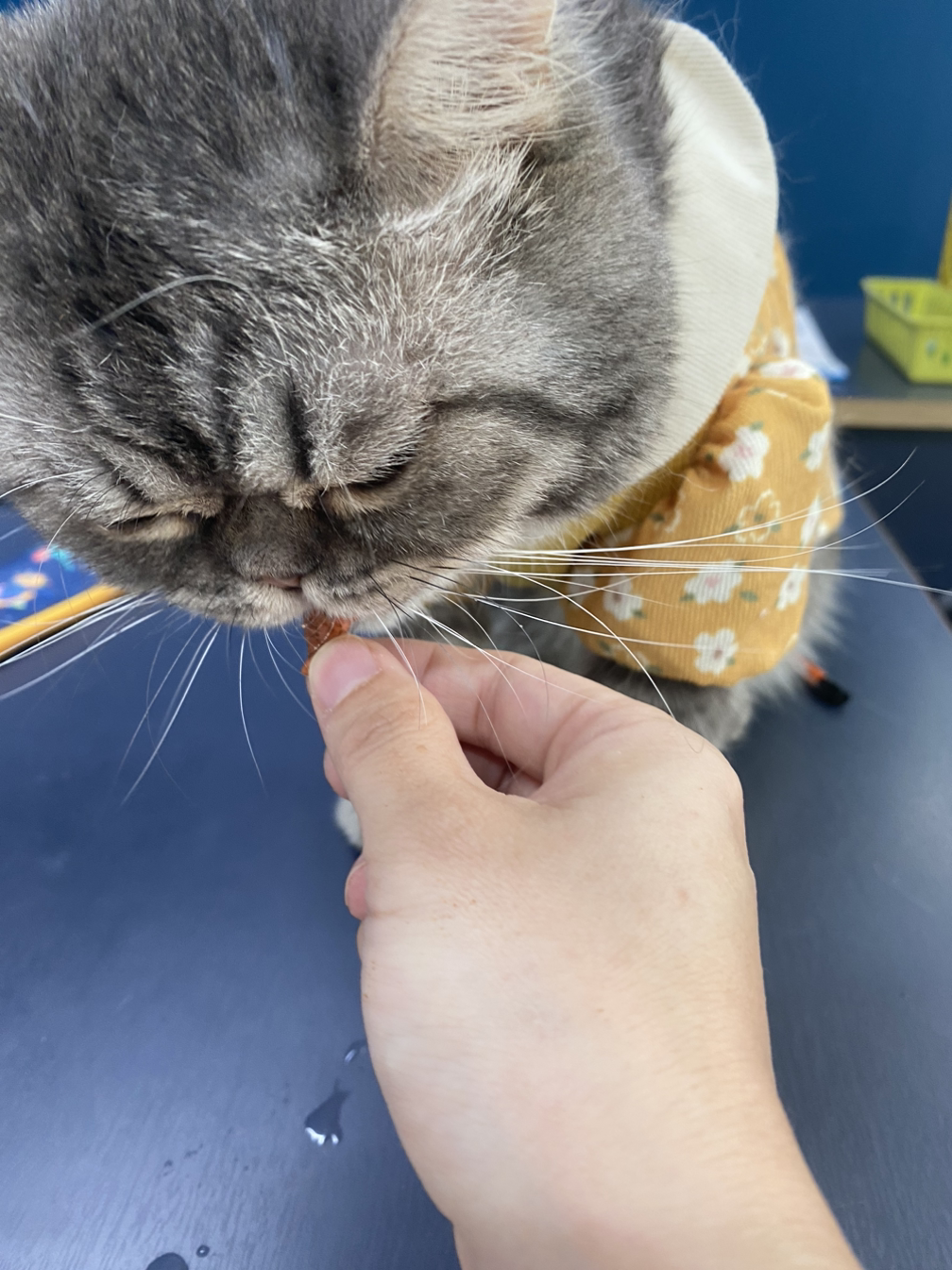 눈곱을 떼주고 두부가 제일 졸아하는 비스킷을 주고