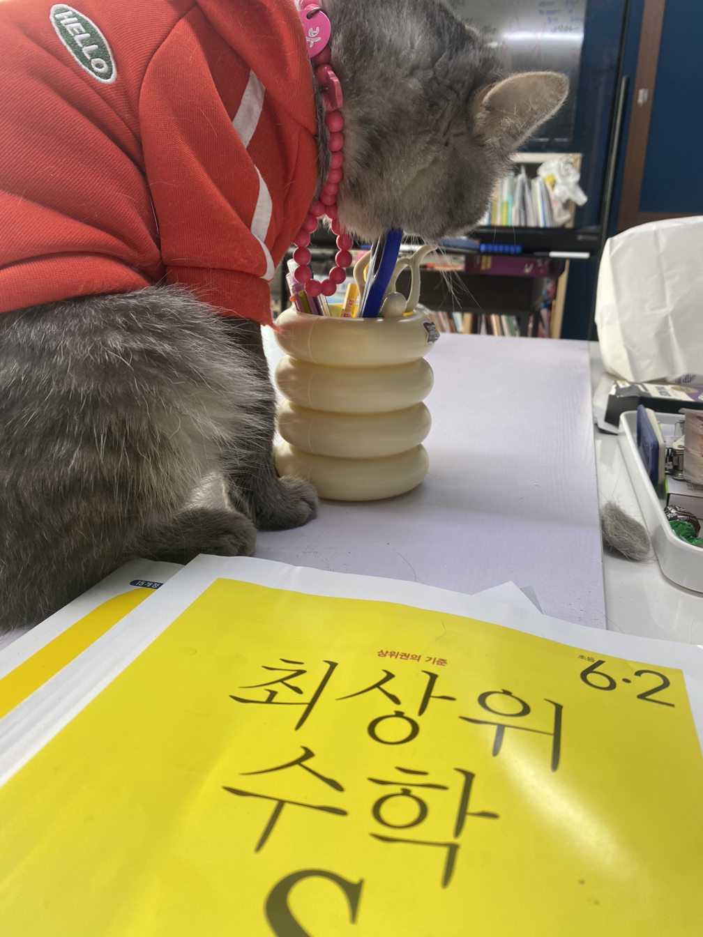 숨숨집을 줘도 안 들어가고 교구 책장에서