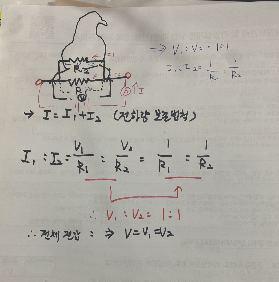 저항을 병렬로 연결하면 각 저항의 양끝이 같은 점에 연결되어 있으므로 전압이 같다.