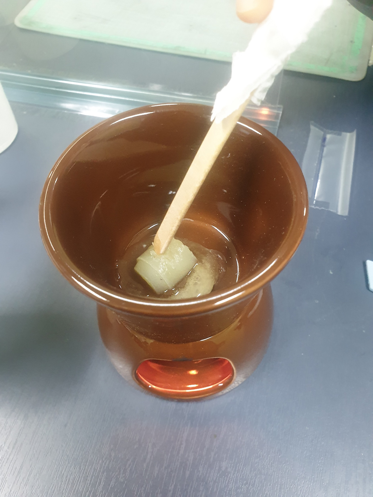 딱풀을 칼로 잘라 퐁듀 해 먹는 가열 기구에 넣고 녹이기 시작했다.