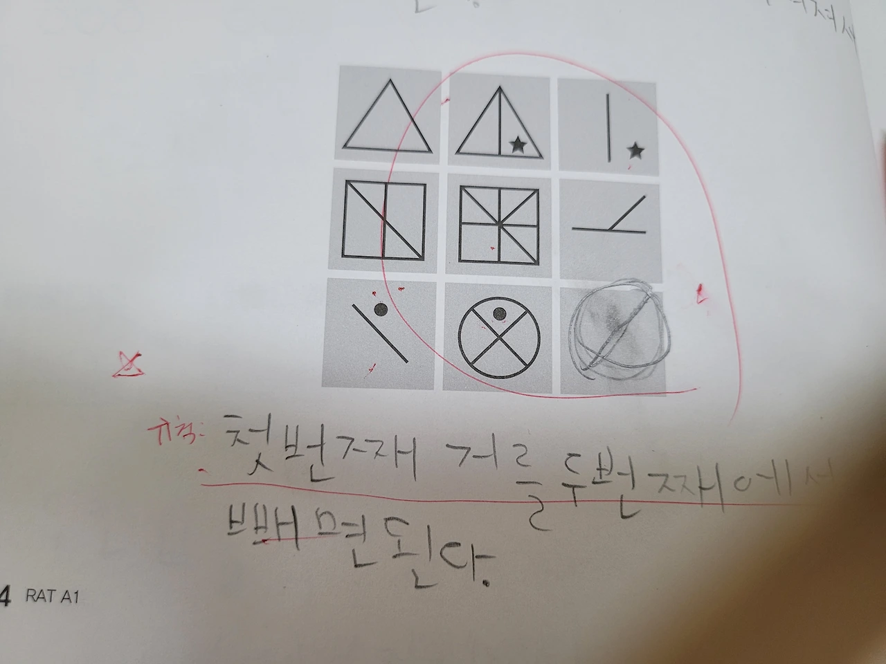 정답은 첫 번째 그림과 세 번째 그림을 합치면 두 번째 그림이 나온다이다.