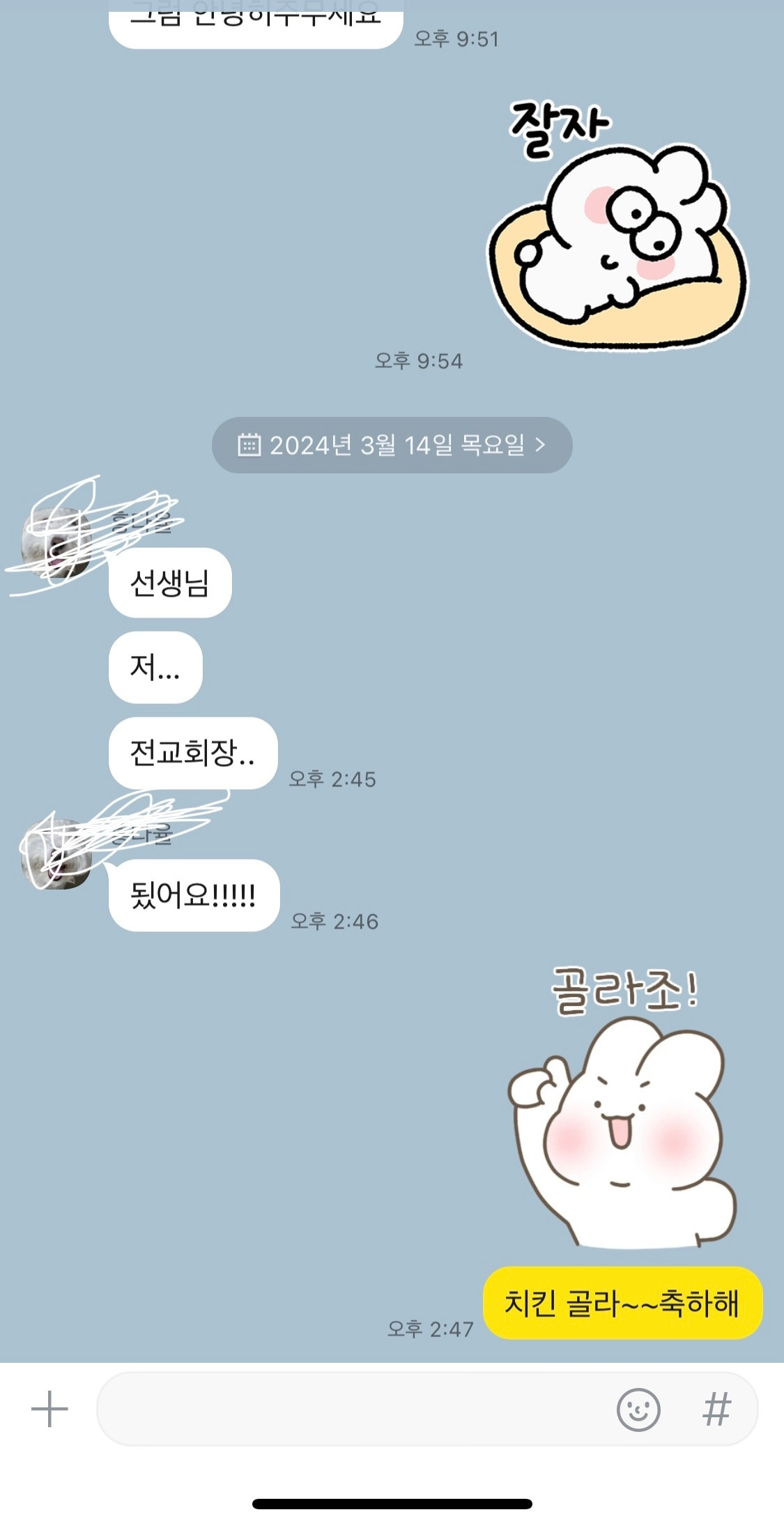 우리의 에이스는 오늘 전교회장선거에 당선이 되었다.제일 먼저 과학 선생님께 연락을 주겠다고 했다.당선이 되면 기념으로 박원장이 치킨을 쏘기로 했기 때문이다.