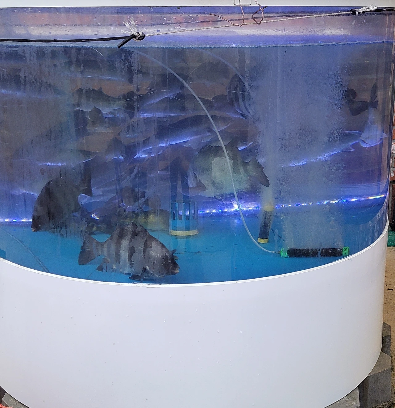 펜션 수족관. 자연산 돌돔, 농어, 능성어 등이 보인다.