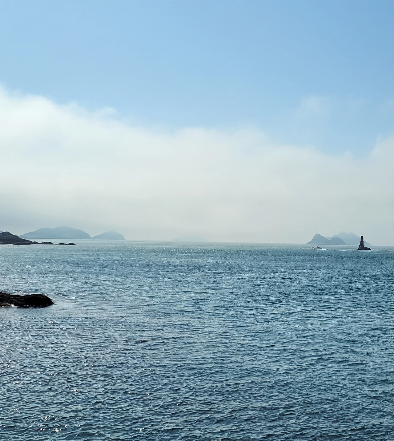신양항에서 보이는 사자섬. 항 밖은 이미 안개와 풍랑 주의보가 떨어졌다.