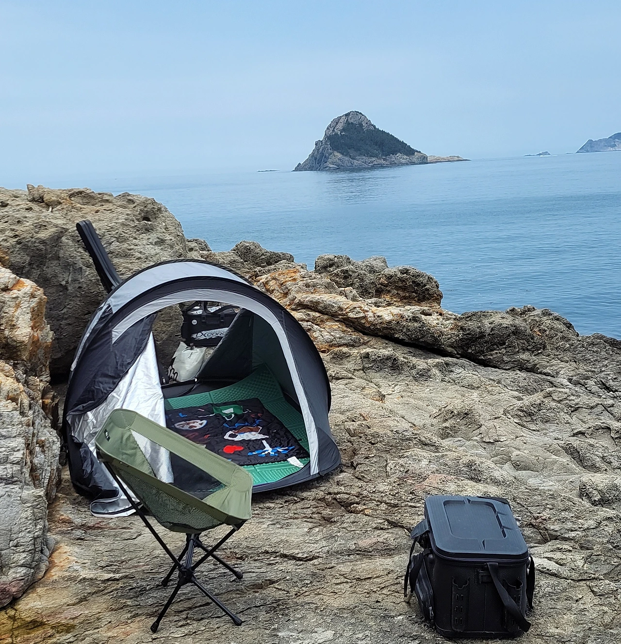 상추자 다무래미 포인트로 갔다. 다행히 배를 타고 진입을 했던 낚시인 두 명이 철수하고 있고 섬에 물이 빠져 있어서 차에서 짐을 두 번에 걸쳐 날라 진입을 했다.(두 번 진입, 철수 총 네 번 짐 나르다 죽는 줄 알았음) 다무래미 포인트는 배를 타지 않아도 물이 빠지는 간조 시간에 진입을 하면 되는 곳이다. 주차도 섬 진입 하는 곳 바로 앞에 안전하게 할 수 있었다. 야영 포인트는 두 명의 낚시인들이 낚시한 곳으로 정하고 텐트를 치고 준비를 해 처음 제대로 낚시를 했다. 낚시를 하는 도중에 울산에서 오신 한 부부팀이 들어왔고 그분들은 내 반대편으로 포인트를 정해 들어갔다. 돌돔을 치러 왔고 열흘 머물다 가신다고 했다. 이분들도 은퇴를 하신 분으로 한번 오면 이리 오래 머물다 가신다 하셨다.