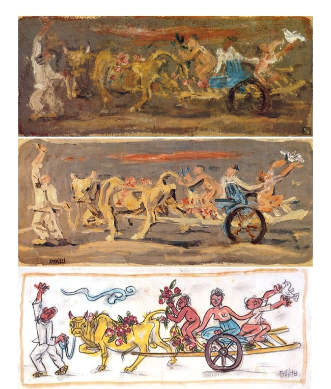 이중섭 <길 떠나는 가족> 여러 버전.하단 3번째 그림은 일본의 가족에게 편지를 보낼때 편지지에 그린 그림.