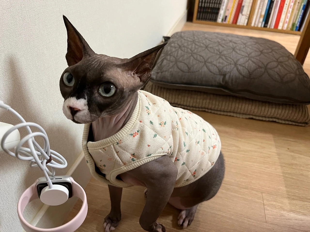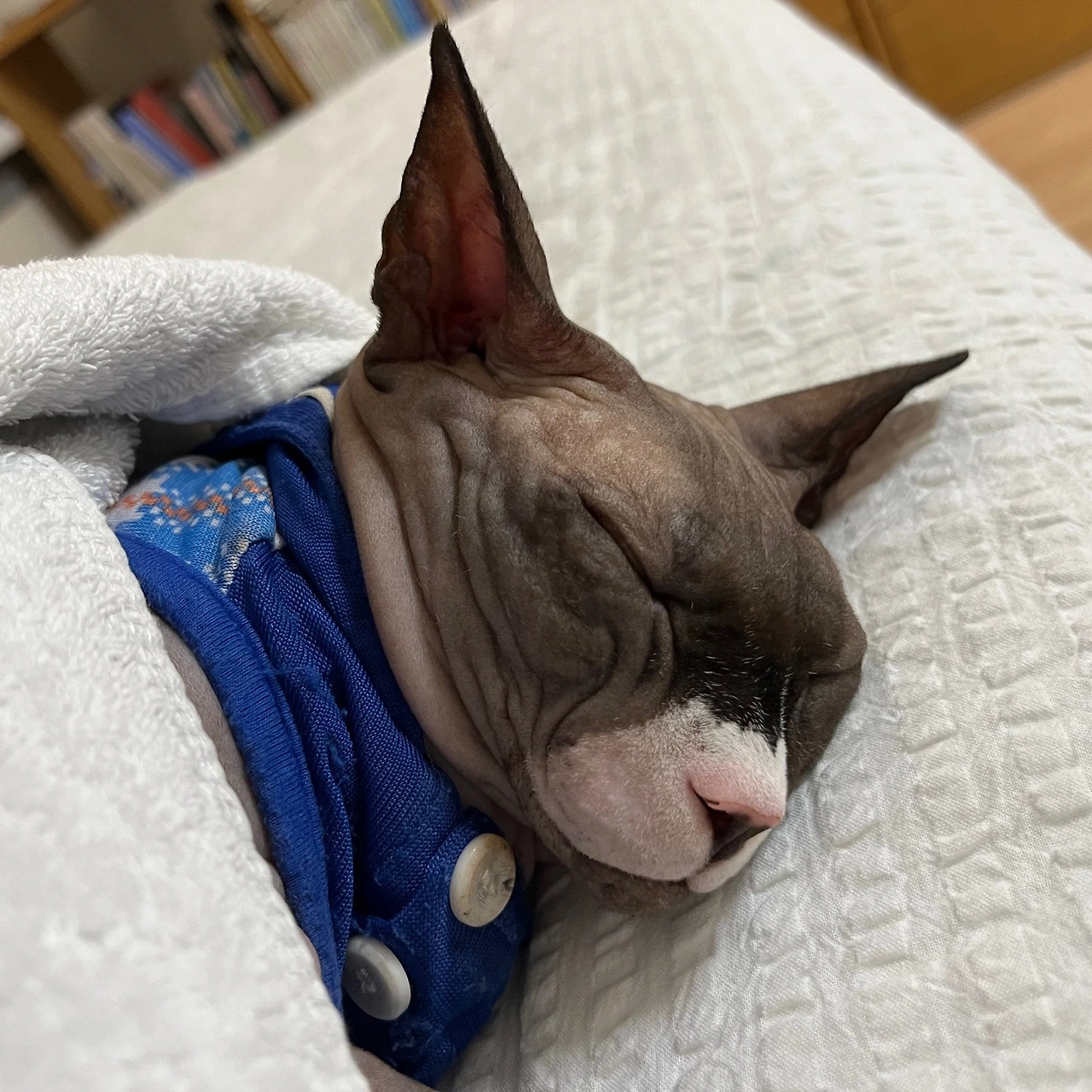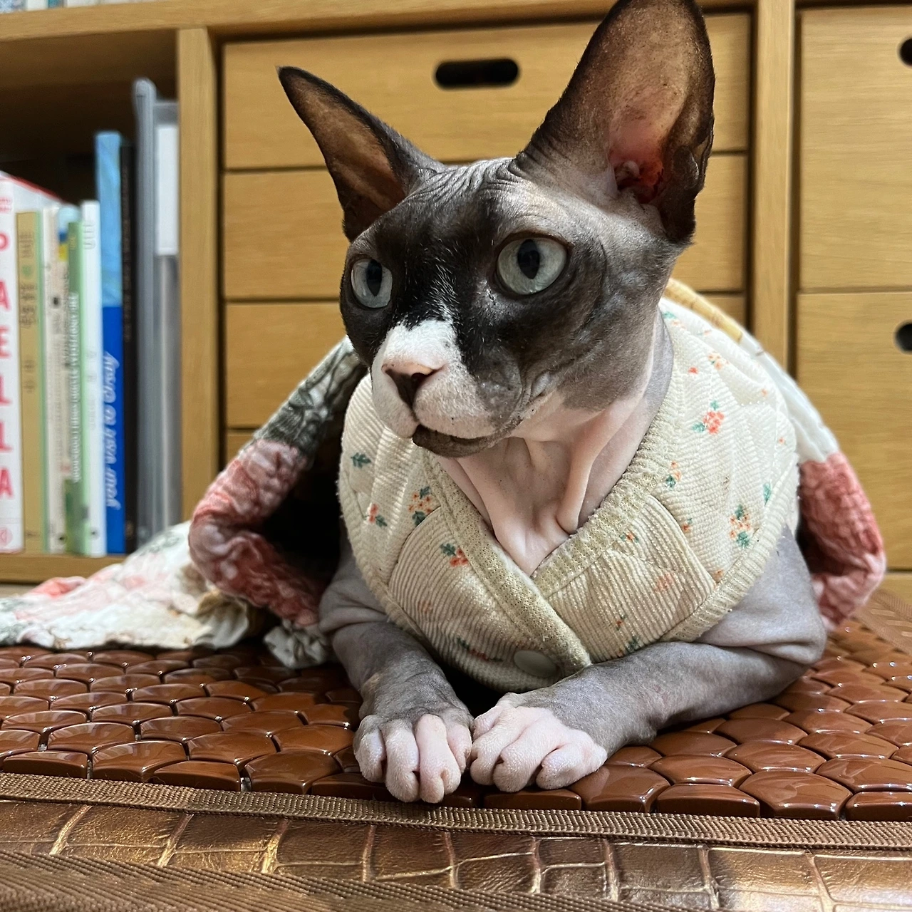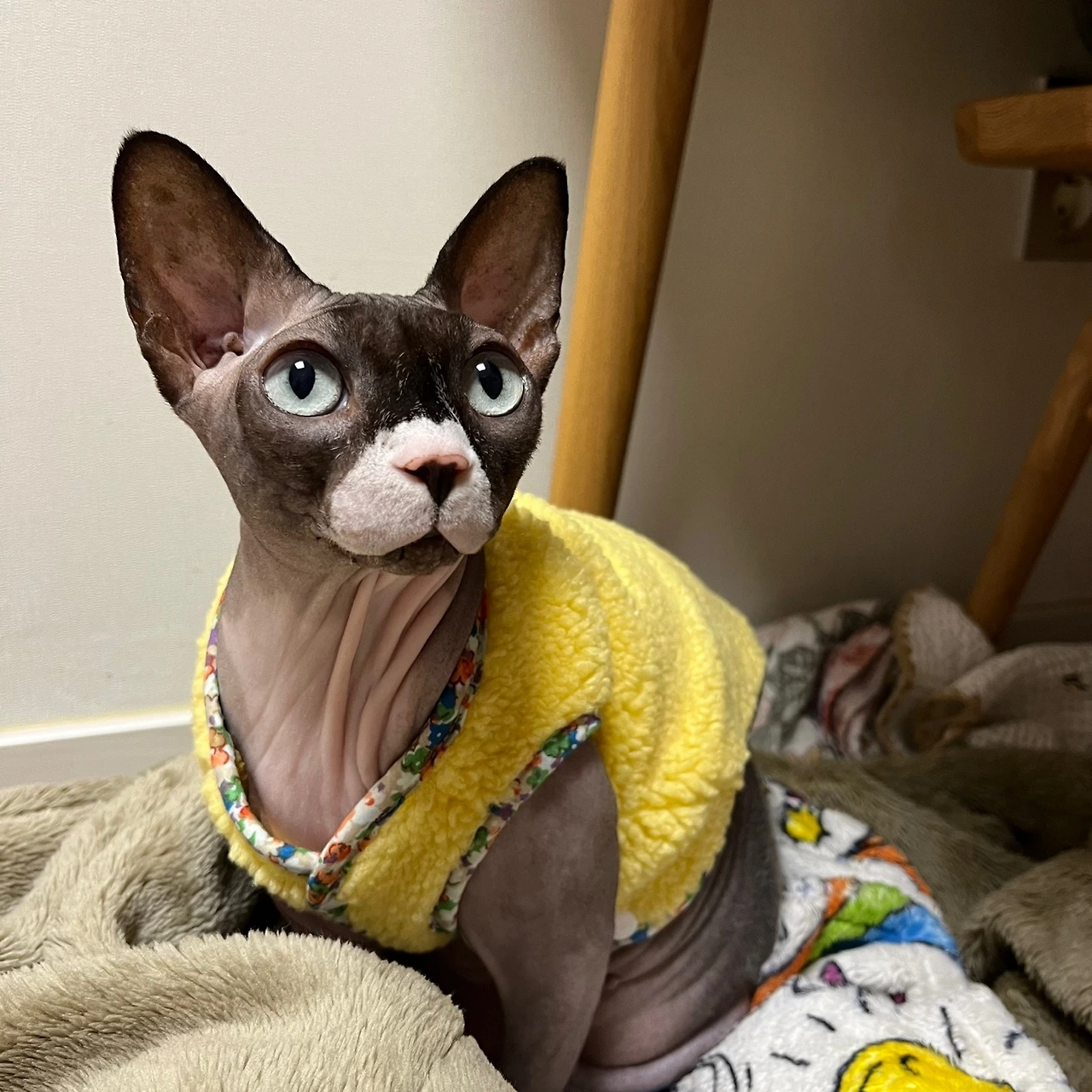 이 고양이는 체온 보존을 위해 옷을 입혀야 하고, 따스한 환경을 만들어야 한다.