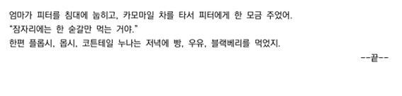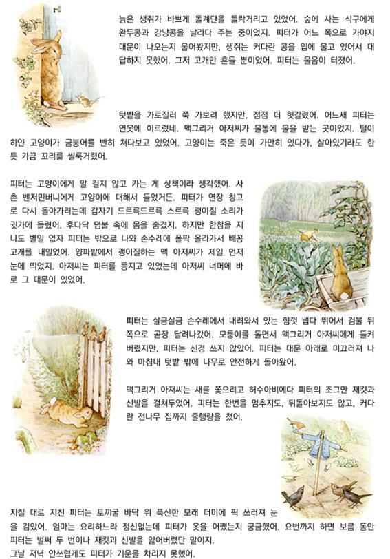 그래도 해야지 제자리 걷기라도 한다는 생각에 짧은 그림책 하나를 골라 연습했다. 고전 중의 고전 '피터래빗 이야기'다. 오래전에 저작권이 만료되면서 퍼블릭 도메인으로 넘어와 자유롭게 사용할 수 있는 작품이 되었다. 한참 내용을 곱씹고, 몇 번을 들여다본 뒤에 바꾸었다. 단숨에 얻어지지 않는 매끄러움을 찾아가면서 말이다. 포기하지 않고 끝까지 잘 버텨준 스스로가 고맙다.