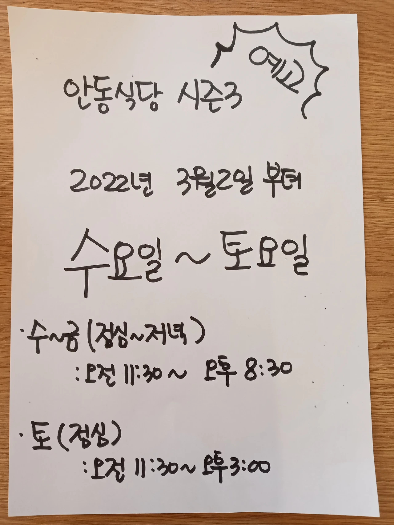 수업일정과 공부시간 등을 반영하여 영업일을 줄이고, 영업시간을 늘리기로 결정했다. 제 멋대로 자주 바뀌고, 메뉴는 한 가지인 어이없는 식당이지만 찾아주시는 손님과 이 공간에 깃든 여러 수고에 화답하고 싶다. 무엇보다 그럴싸한 핑계로 도망치고 싶지는 않다.