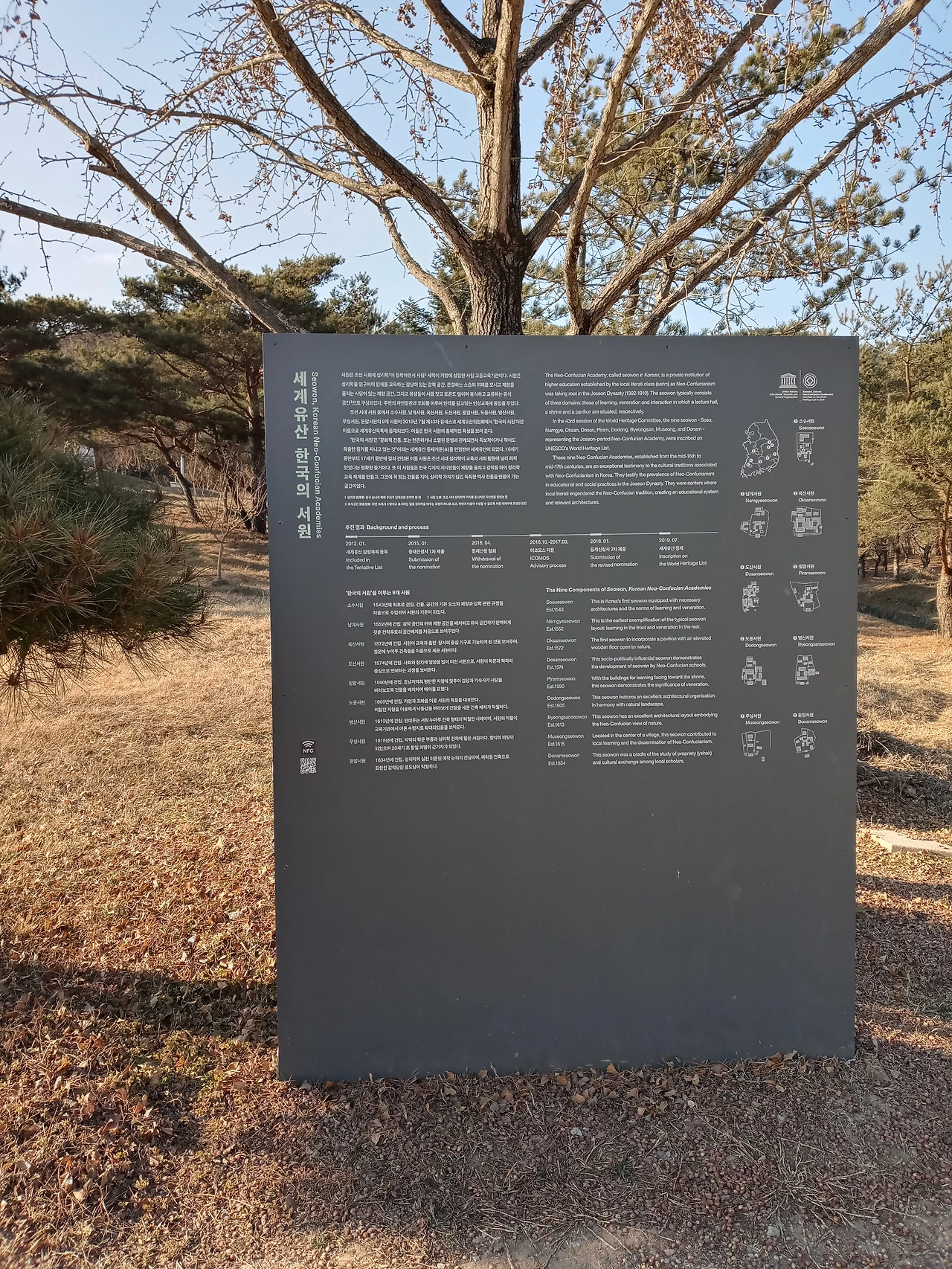 서원의 입구에는 500년 된 소나무들이 거북 등껍질을 감싸고 하늘로 쭉쭉 뻗어 나있다. 관리번호를 매겨 세심하게 관리된 소나무들은 사철 푸른 잎처럼 항시 정진하는 배움의 자세와 같아 학자수라 한다고 한다. 사람이 부여한 의미를 뛰어넘어 시간을 품은 풍경은 노을이 지는 해 질 무렵에 고요함으로 감성을 압도한다.