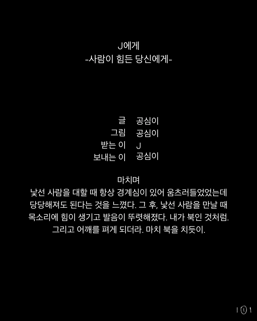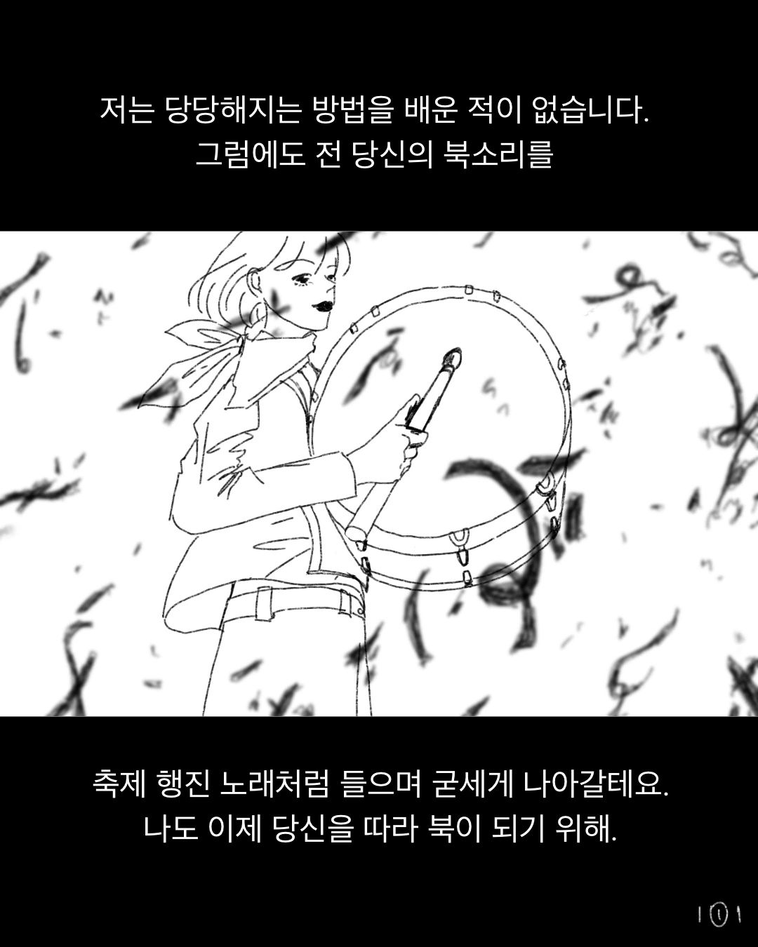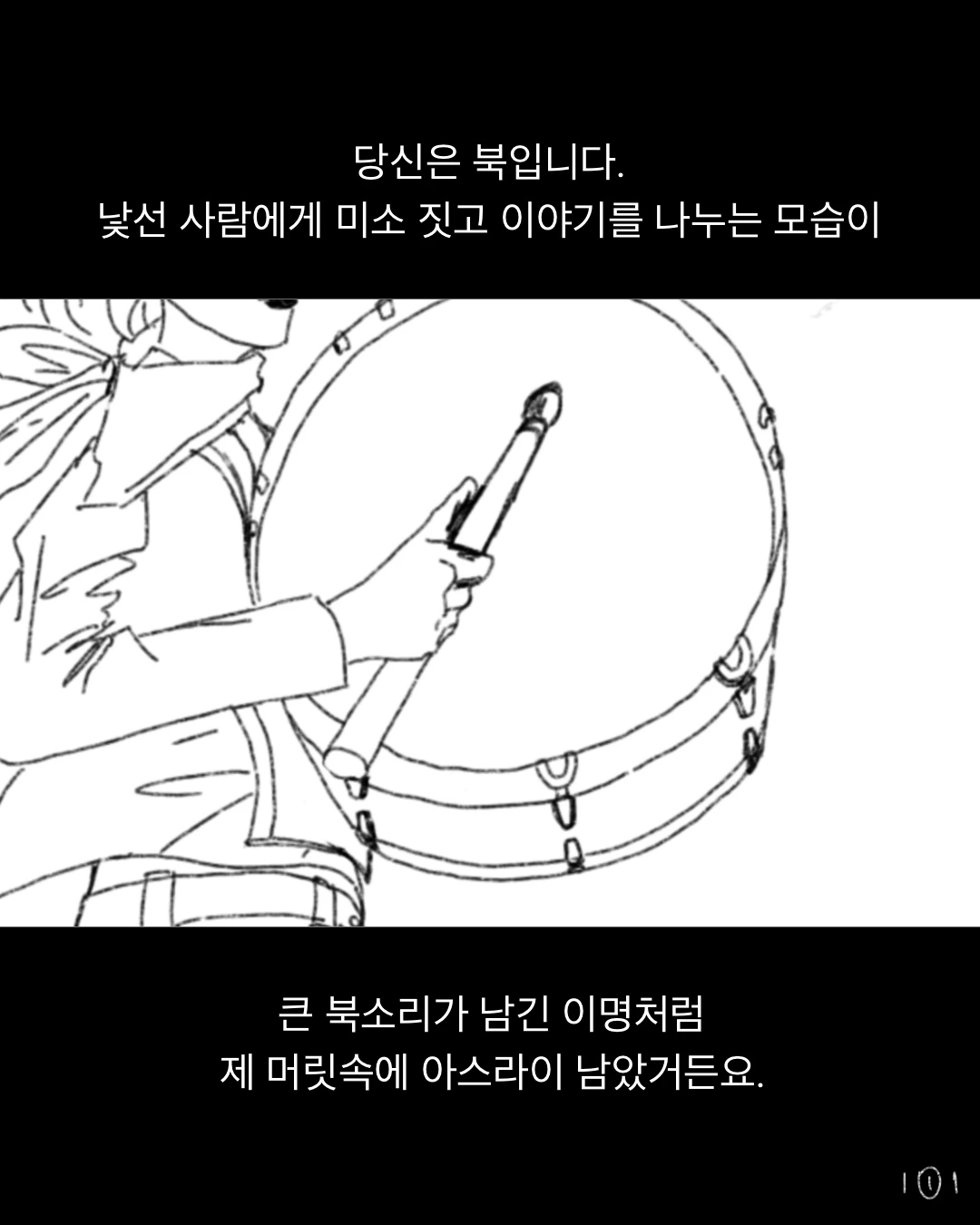 당신은 북입니다. 낯선 사람에게 미소 짓고 이야기를 나누는 모습이 큰 북소리가 남긴 이명처럼 제 머릿속에 아스라이 남았거든요.