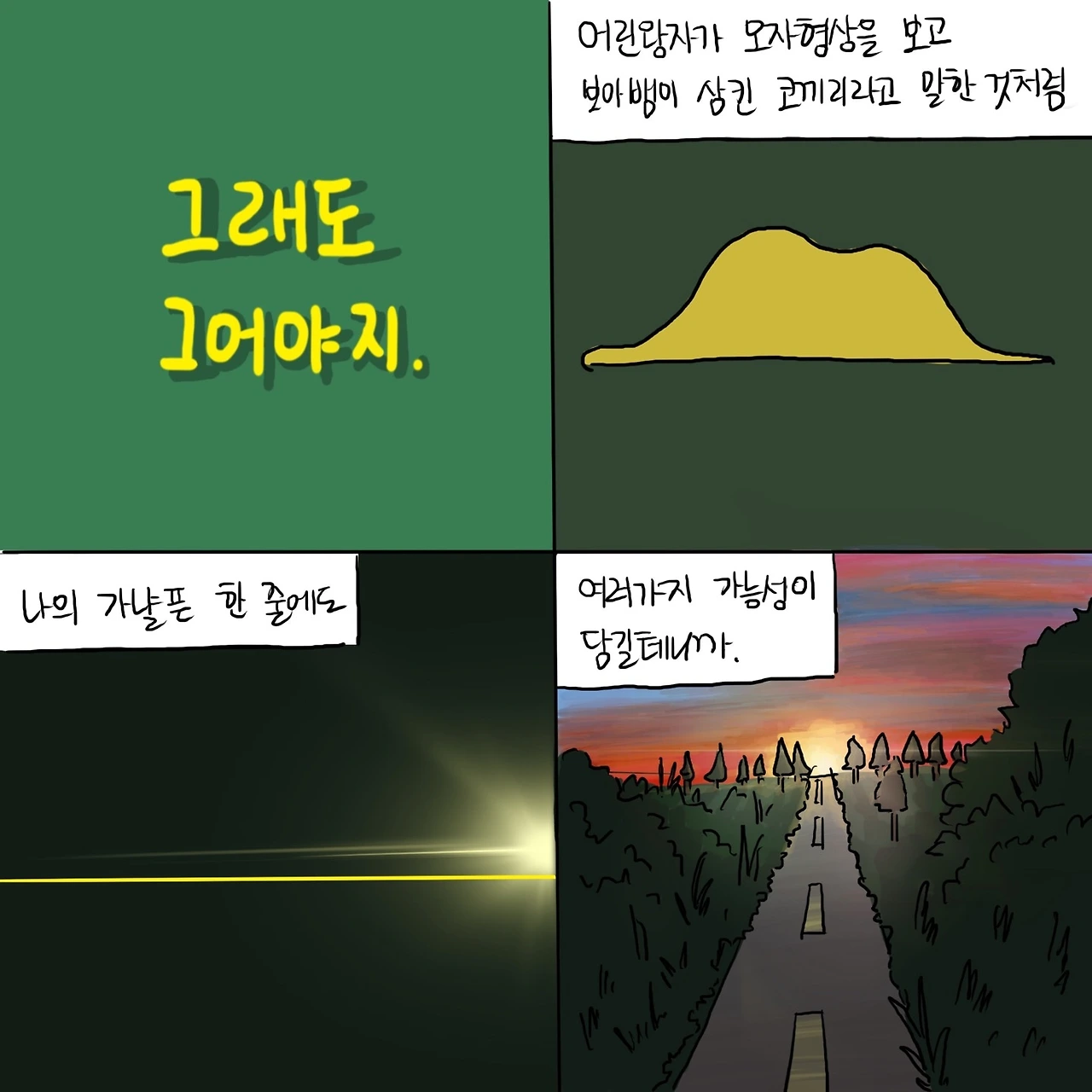 그래도 그 부끄러운 선 하나라도 현실에 내놓으면 그 선에서 어떤 것들이 피어오를지 모른다. 불안함 속에 머무는 무한함. 비록 지금은 불안하더라도 미래에는 그 선들이 나를 다른 세계로 인도할 수 있다. 그래서 나는 계속 불안함을 느끼며 선 하나라도 긋는 현실을 살기 위해 노력하고 있다!