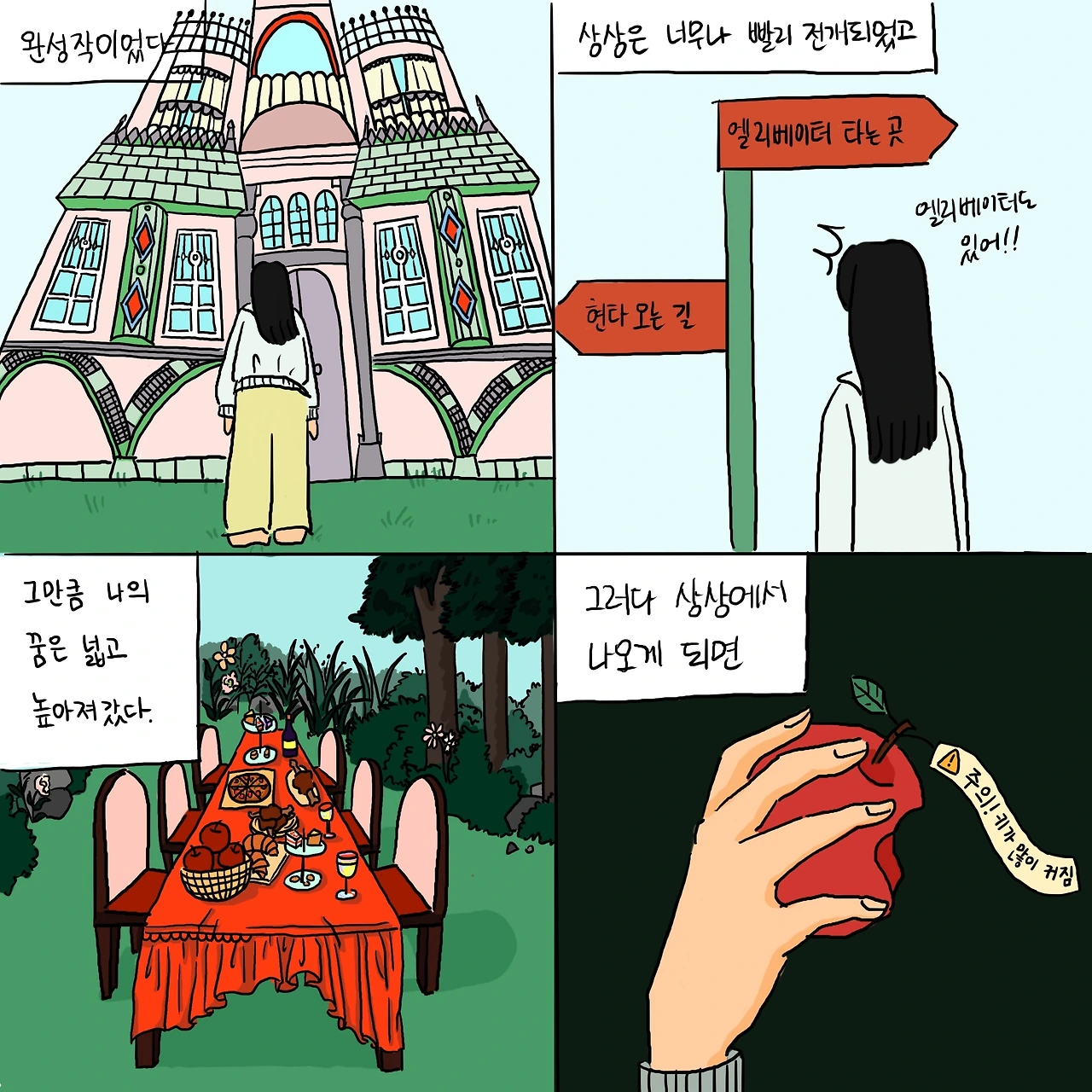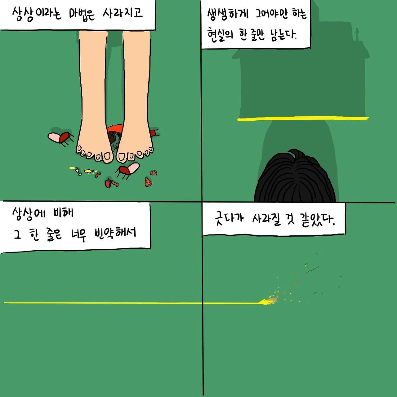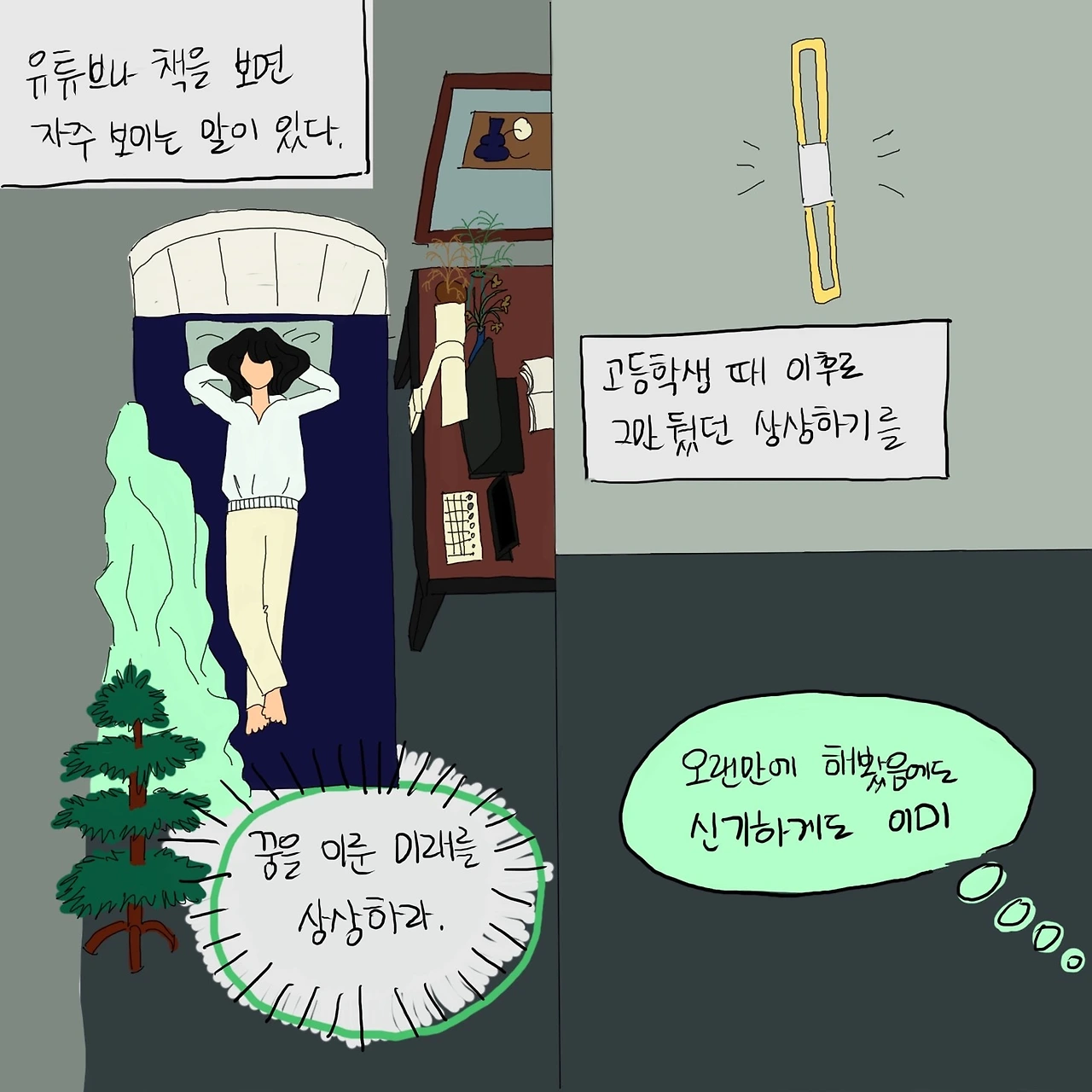 무기력할 때는 선 하나 긋는 것과 같은 작은 시작조차 무섭다. 상상했던 것과는 다른 현실이 매섭게 휘몰아친다. 완벽하지 않은 시작에 대한 실망감, 부끄러움, 분노. 그것들은 나를 더 무기력하게 만들어서 상상 속으로 도망치게 만들었다. 성공한 사람들이 추천하는 상상하기는 그런 게 아닐 텐데.