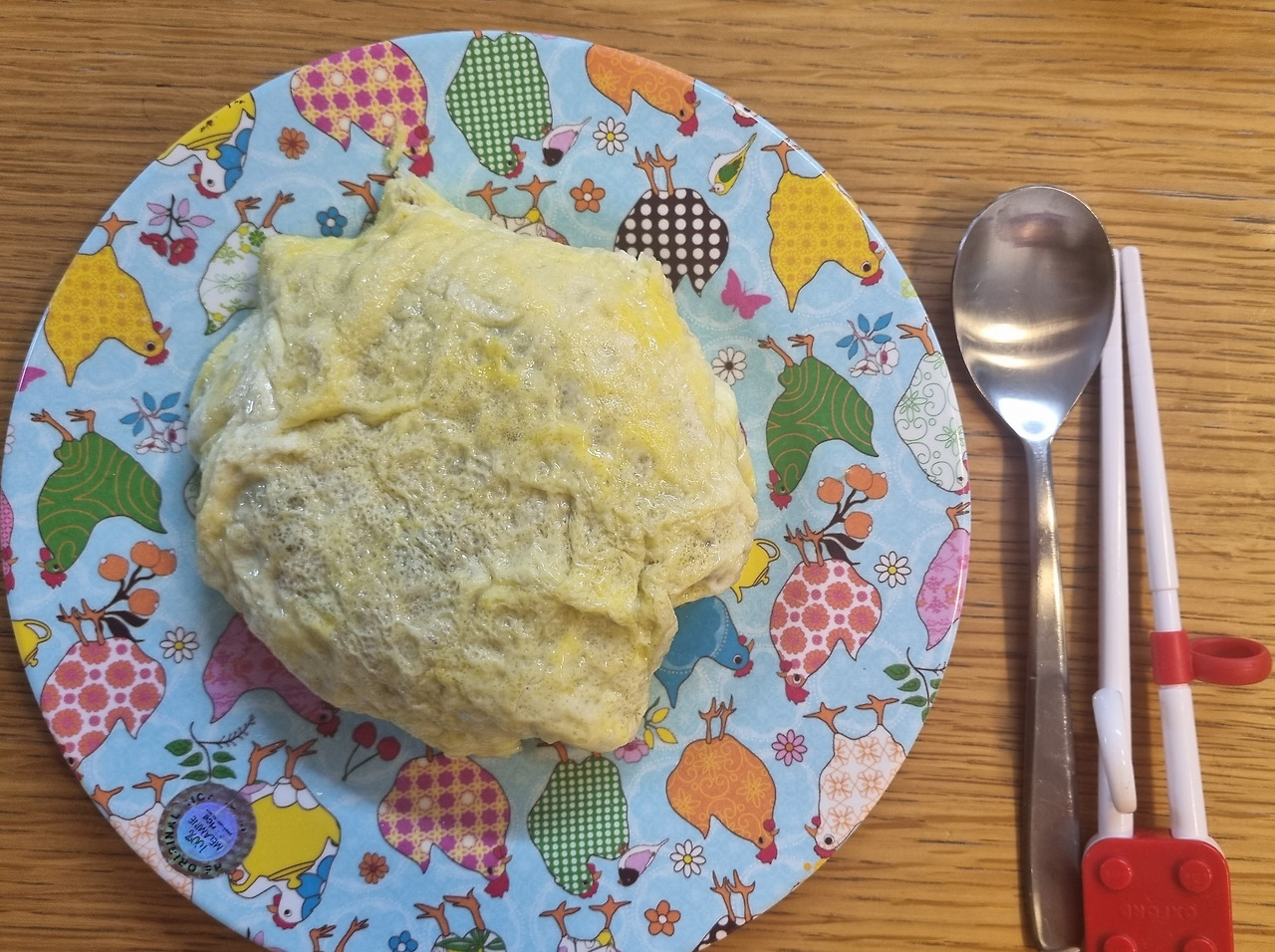 1번의 볶음밥위에 계란 지단을 얇게 펴 밥을 감싼다. 같은 볶음밥이지만 색깔이 다르니, 이아이는 오므라이스이다. 캐찹은 당연히 필수 이다.