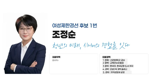 청년의 미래와 시니어의 경험을 연결하는 정책을 실현하고자 비례대표 시의원에 도전하는 조정순입니다.