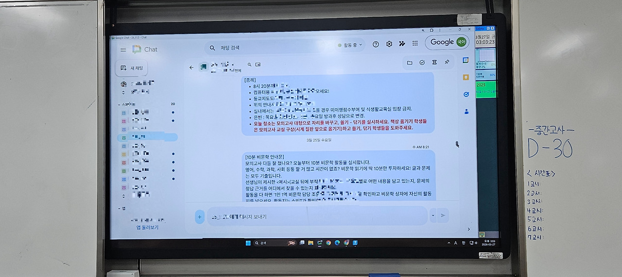 이럴 때는 교실 화면에 '구글챗'을 깔고 매 쉬는 시간마다 정보도우미 또는 반장, 부반장에게 구글챗 화면을 켜놓도록 한다.