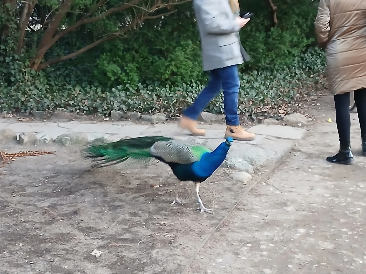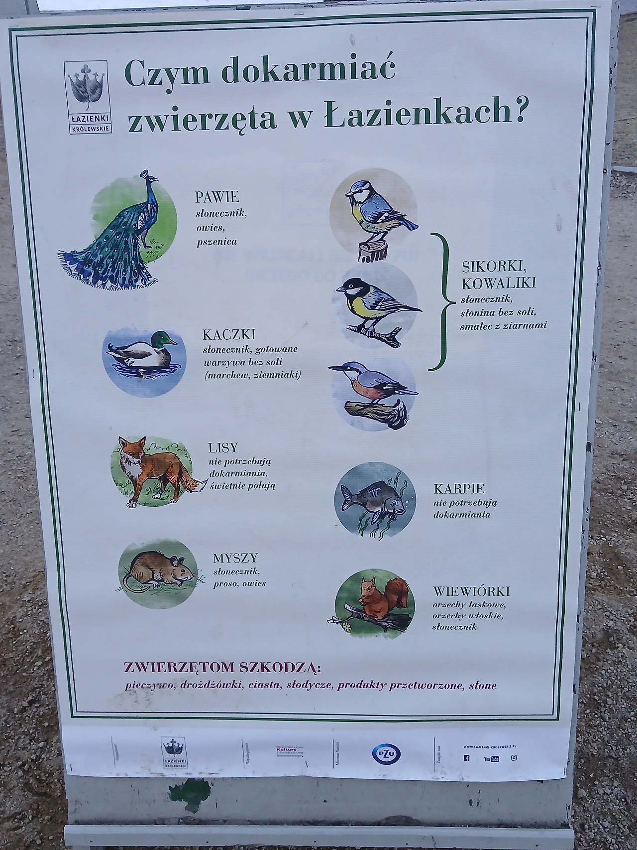 다시 와지엔키 공원 쪽으로 방향을 돌리니, 이번에는 큰 호수에 다다랐다. 친절하게도 앞에 큰 표지판이 근처에 어떤 동물들이 서식하는지 알려주고 있었다. 처음에는 그러려니 하고 넘어갔는데, 얼마 안 가 공작새가 돌아다니는 걸 발견하고는 다시 그 표지판에으로 눈을 돌렸다. 살아생전 야생 공작새를 내 눈으로 직접 보게 될 줄이야.