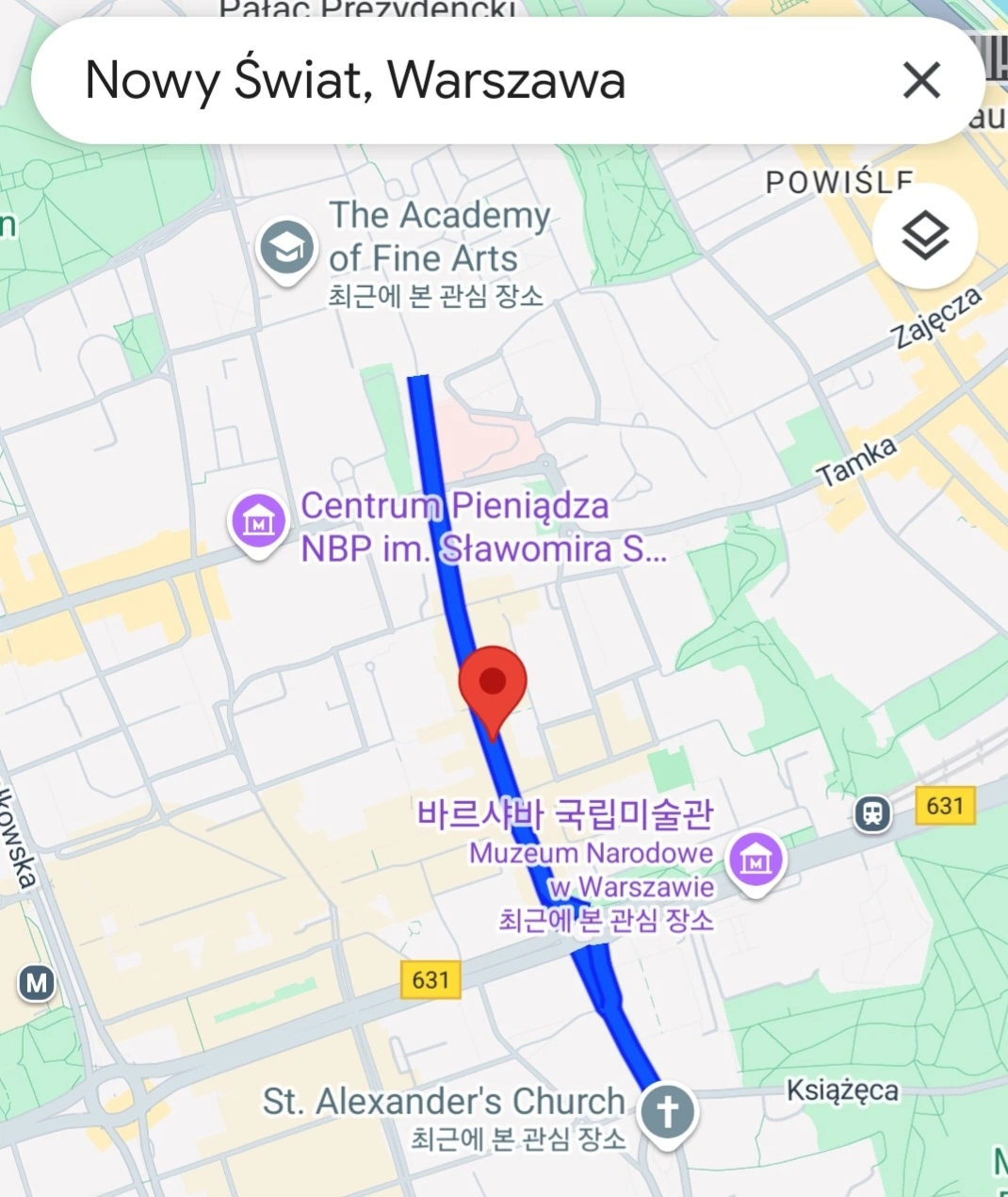 수업이 끝나고 오후에 시간이 비어서, 그날은 바르샤바 어딘가를 돌아다니고 싶은 마음이 컸다. 생각보다 저녁 파티 때까지 시간이 많이 남아서, 혼자 천천히 어딘가를 돌아다니기에는 충분했다. 어딜 갈까 고민을 하다가, 어렴풋이 폴란드 여행책자에서 딱 추천했던 거리가 하나 생각났다. <노비 쉬비아트(Nowy Świat)>, 바르샤바의 번화가.