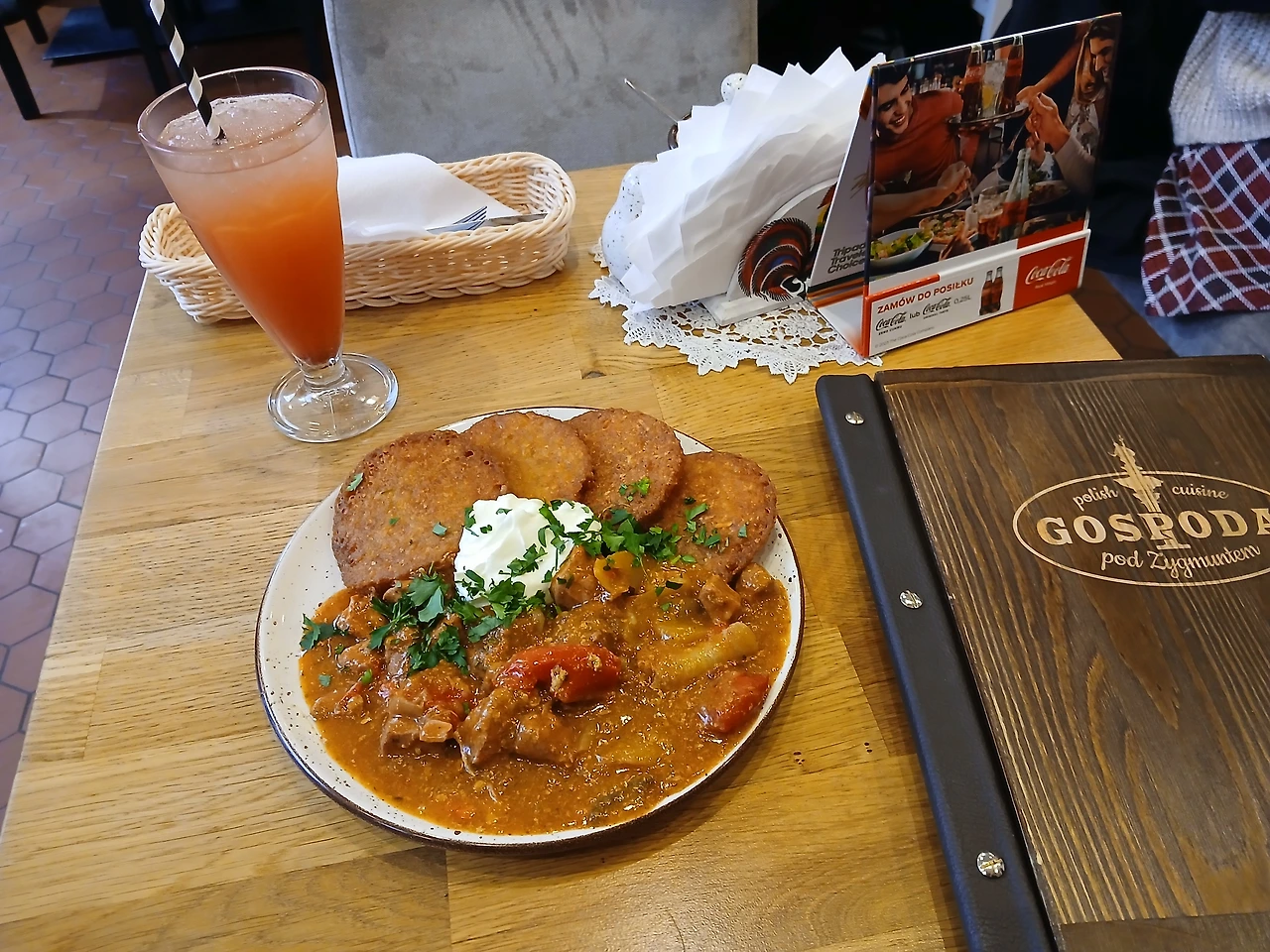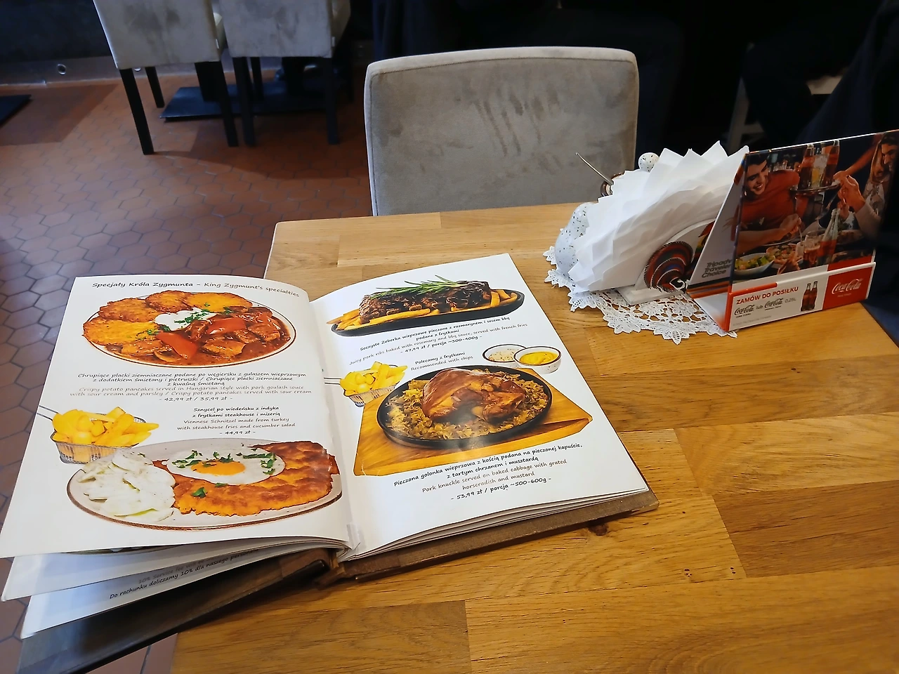 그렇게 생애 처음으로 들어간 현지 식당. 식당 안에는 폴란드스러운 민요가 흘러나오는 분위기와 함께 여종업원이 미소를 띠고 필자를 반겼다. 유럽 여행 초보자라 많이 긴장한 나마저, 직원들의 사근한 태도에 풀어질 정도였다. 메뉴판을 들고 보니, 이 식당은 정식 요리와 함께 레모네이드 음료도 같이 제공하는 것 같았다. 그래, 이왕 처음 온 현지 식당인데, 오늘은 한 번 과감하게 가 보자. 한 번 큰 마음먹고, 과감히 점원에게 손가락으로 본인이 고른 메뉴를 가리킨다.