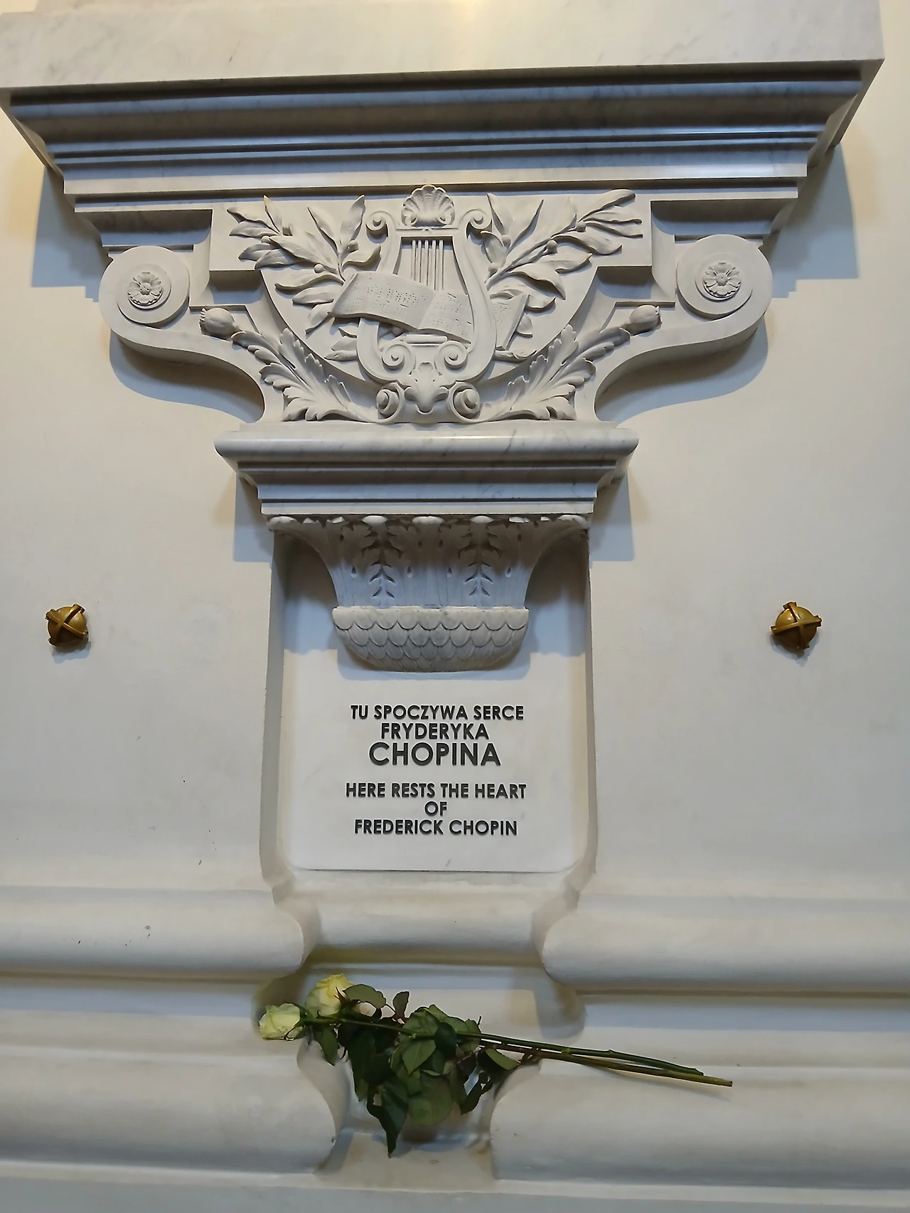 그리고 그 심장의 위치가, 바로 위의 사진의 가운데 부분에 보관되어 있다. 참고로 쇼팽의 시신은 프랑스의 <페르라셰즈 공동묘지(Père Lachaise Cemetery)>에 잠들어 있다고 한다. 제2차 세계대전 때 성당이 크게 파괴되면서 나치 독일이 쇼팽의 심장을 꺼낸 적이 있다고 하던데, 부디 이제는 심장이 어디 옮겨지지 않고 푹 쉬었으면 좋겠다.