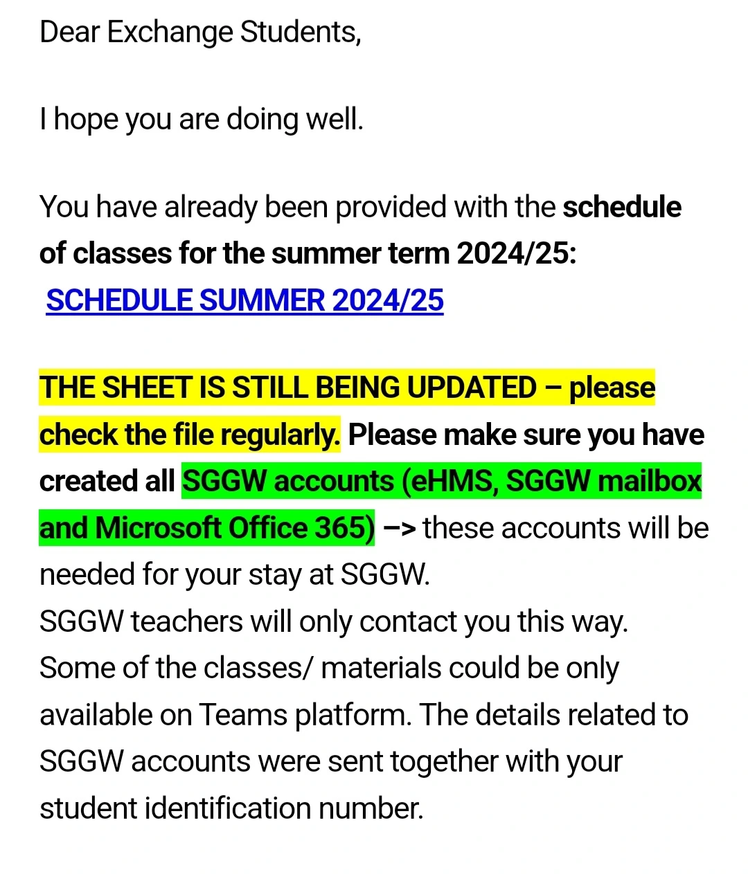 폴란드 입국에 성공한 첫째 주! 드디어 학교 담당관이 위 사진과 같은 메일을 각 교환학생들에게 보냈다! 수업시간표가 여태껏 정해지지 않다가, 수업이 시작되고 나서야 겨우 가닥이 잡혔다는 얘기다. 떨리는 마음으로 조심스럽게 누르는 수업시간표. 두근두근. 과연 투리는 처음에 넣은 수업 그대로 갈 수 있을 것인가?