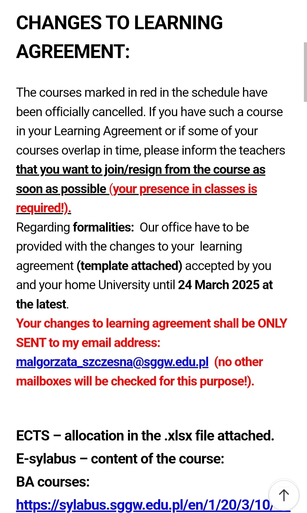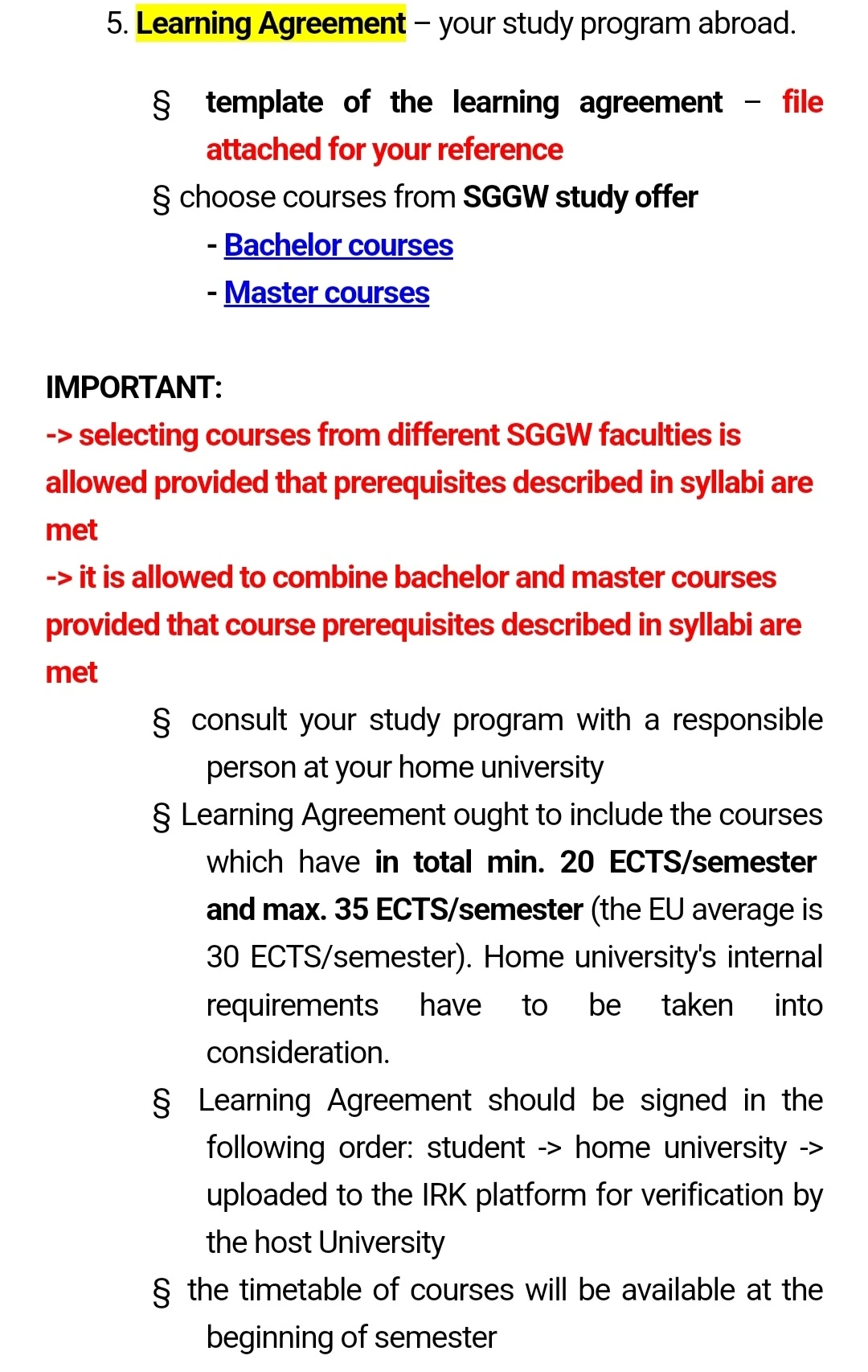 자, 때는 폴란드로 가기 몇 달도 전인 11월 말. 한국 본교에서 교환학생 최종후보자로 선정이 되었다면 학교에서 메일을 보내는데, 위 사진이 그중에서 수강신청에 관한 공지만을 잘라서 올린 부분이다. 프롤로그에서 교환학생 이후의 준비과정을 말할 때 learning agreement를 제출해야 한다고 말한 적이 있었는데, 그게 바로 수강신청을 말하는 것이다.
