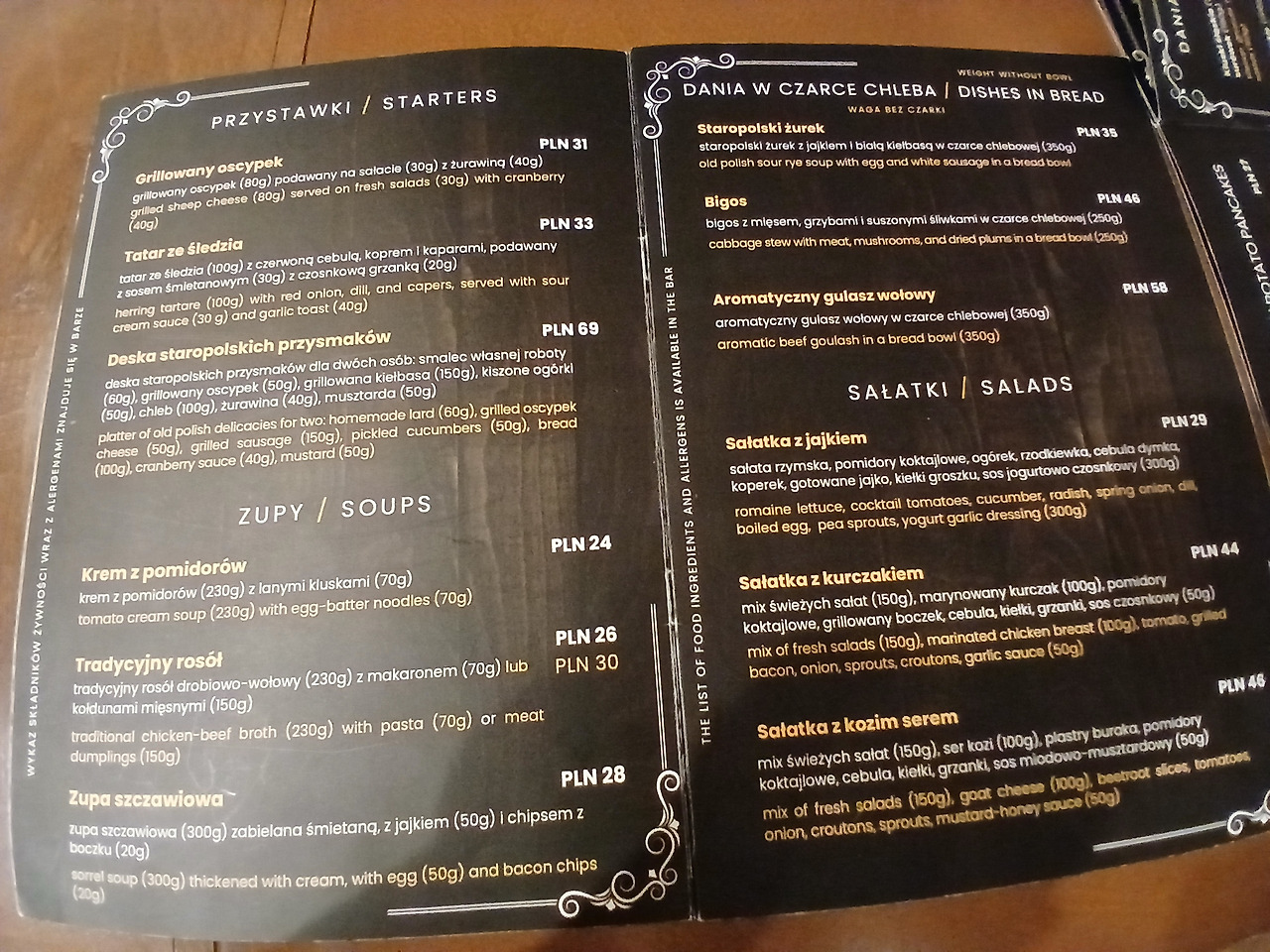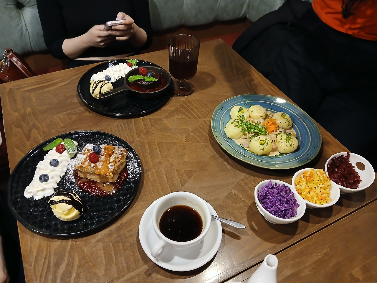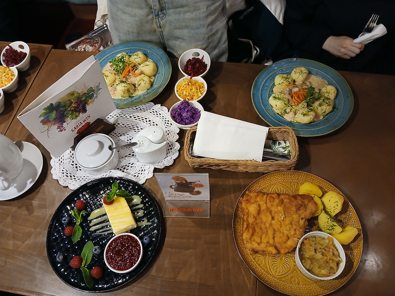 각자 주문 끝에 나온 음식들이 오른쪽 위의 사진인데, 저 요리들이 딱 전형적인 폴란드 음식에 해당된다. 여러 가지가 추가된 형태의 감자와 납작 돈가스처럼 생긴 고기. 여러분이 유럽에서 무언가를 먹는다면, 감자를 먹을 일이 많이 있을 것이다. 미리 알아두시길.
