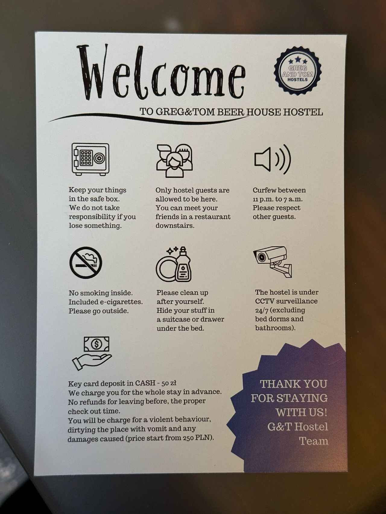 지금 쓰고 있는 글이 폴란드에 대한 글이니, 폴란드에서 흔히 볼 수 있는 형태의 숙박시설에 관한 설명도 좀 더 추가하겠다. 폴란드에는 호스텔, 게스트하우스, 아파트 등 다양한 형태의 숙박지가 있다. 그런데 본인이 보았을 때 이런 형태는 폴란드에만 있던 걸로 기억하는데, 체크인을 확인하는 사람이 없는 경우도 있다! 저런 경우는 미리 개인 문자나 이메일을 통해 대문의 비밀번호를 알려준 다음, 본인이 어느 방에 들어가야 하는지까지 친절히 알려준다. 어떤 경우는 도착하면 연락을 따로 걸어야 하는 경우도 있었지만, 대개는 문자가 시키는 정보를 토대로 본인이 혼자 방을 찾아갔다. 혹시 다른 국가들도 마찬가지의 방법으로 운영하는 숙박지가 있다면 추가로 댓글 부탁한다. 본인도 유럽 모든 대륙을 다 돌아다닌 건 아니라 모르는 부분도 있으니까.