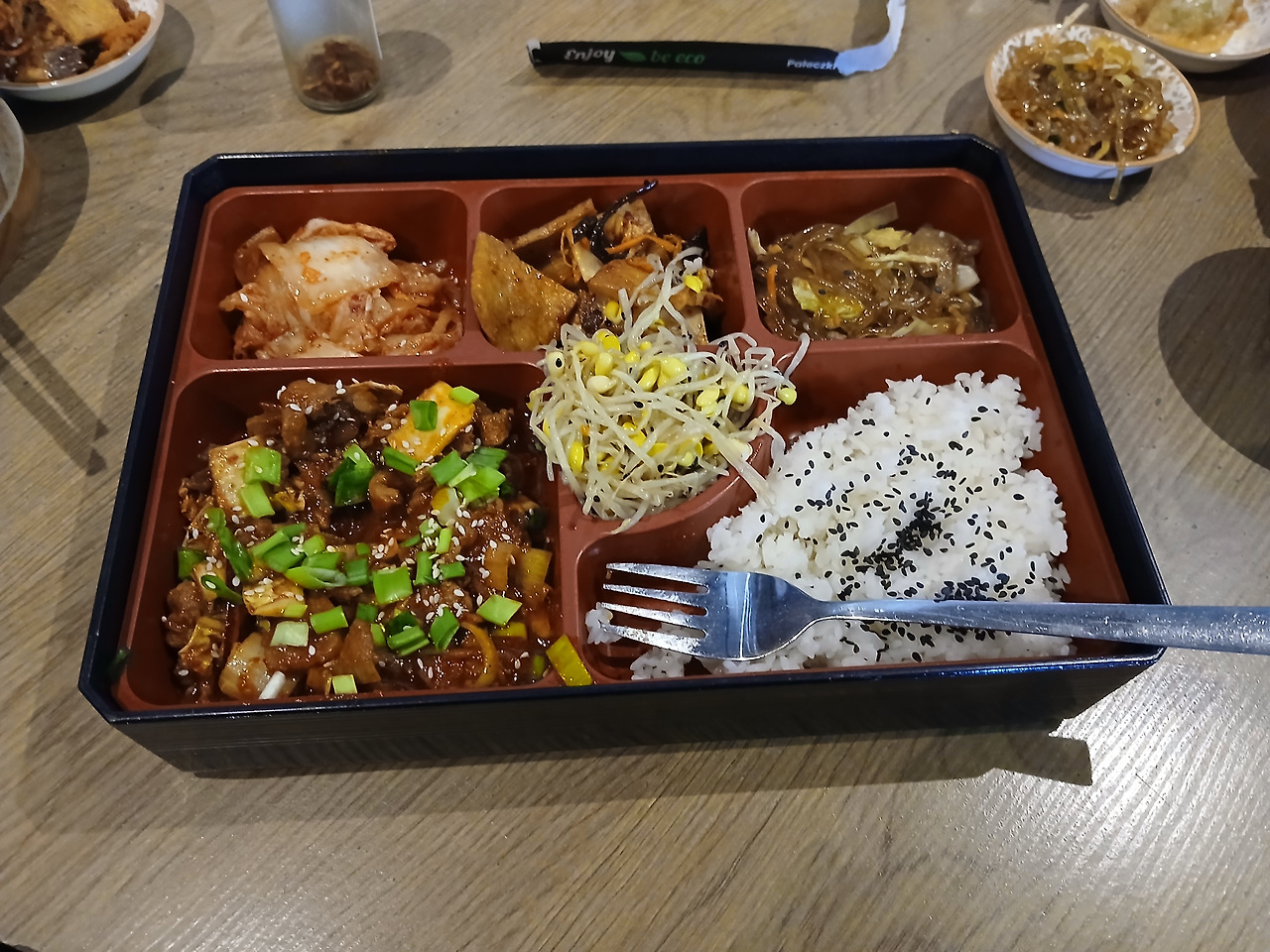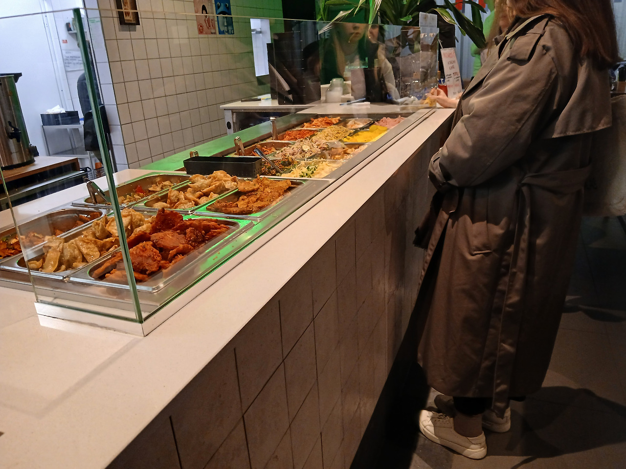 현지인이 데리고 온 식당이라는 말은 그곳이 곧 찐 폴란드인이 좋아하는 식당이라는 방증. 처음에 마티가 데리고 갔던 일식집이나 여기나 안은 사람들로 바글바글했고, 들어가기 전에는 줄까지 서야 했다. 아이러니한 게, 본인은 한국인이면서 처음에 식당 메뉴가 적응이 안 되었다. 오른쪽의 사진에서 줄을 서다가 본인의 차례가 되면 먹고 싶은 반찬의 번호를 불러서 말하는 식이었는데, 사진이 없는 메뉴를 보니 해당되는 번호의 음식이 어떤 음식에 해당하는지 갈피를 잡을 수가 없었다. 어떤 요리가 나온다는 사전 정보도 없이 들어가다 갑자기 영어 메뉴판을 보니까 뇌정지가 나와버린 것이다. 심지어는 직접 반찬을 확인했음에도 대부분이 한국어로 어떻게 부르는지 모르는 것들이었다.